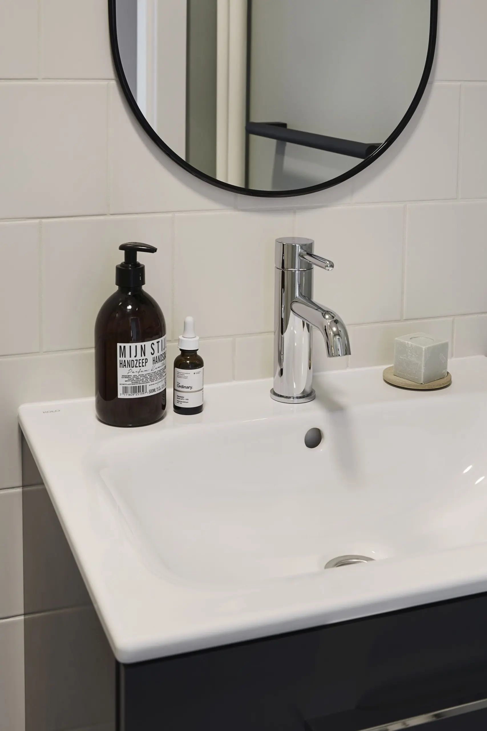 Z minimalistycznym kształtem toalety komponuje się chromowany, błyszczący przycisk spłukujący marki Geberit dzięki czemu całość wygląda klasycznie i elegancko. Przycisk wykonany z wytrzymałego tworzywa sztucznego posiada dwa zakresy spłukiwania, co wpływa na oszczędność wody użytej do spłukiwania. W pomieszczeniu znajduje się prysznic z kabiną z chromowanymi detalami, a całości dopełnia duże, owalne lustro z cienką, czarną ramą. Ze względu na niewielką kubaturę w łazience zrezygnowano z pralki, która została umieszczona w zabudowie meblowej w holu. Zabieg ten pozwolił zaoszczędzić cenne miejsca w łazience oraz stworzyć wygodną przestrzeń na pralnię.