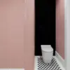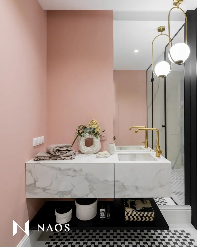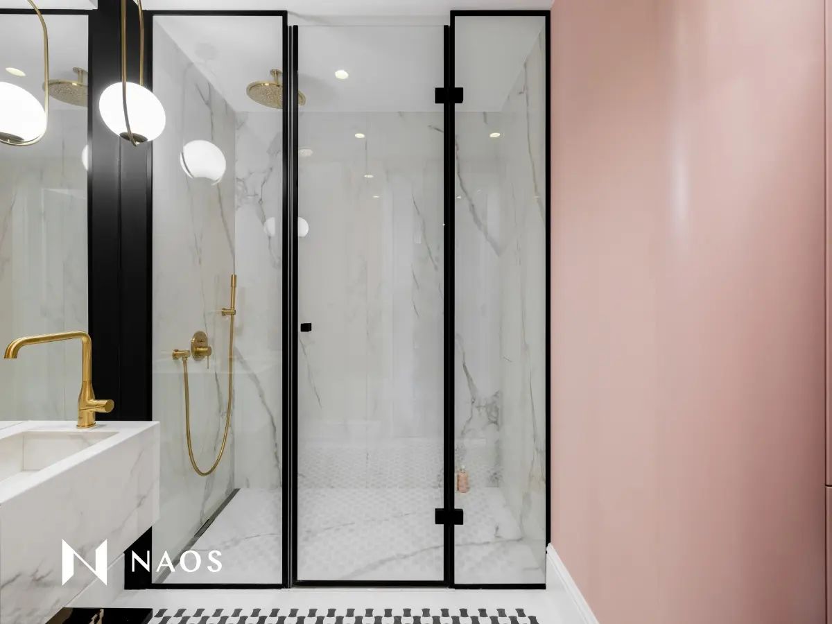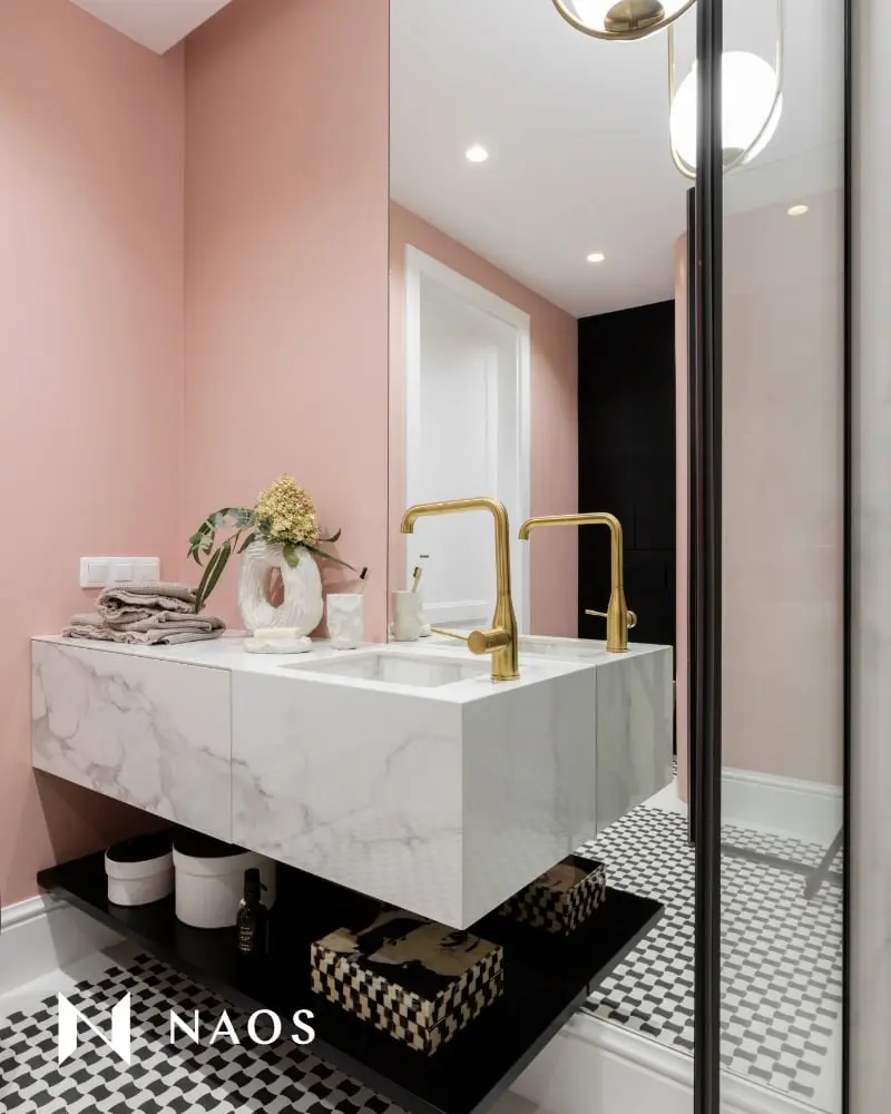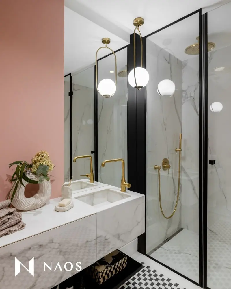 W łazience na podłodze ułożono biało-czarne gorseciki, a w strefie prysznicowej wielkoformatowe płytki marmurowe. Szlachetności dodaje złota armatura prysznicowa oraz umywalkowa.