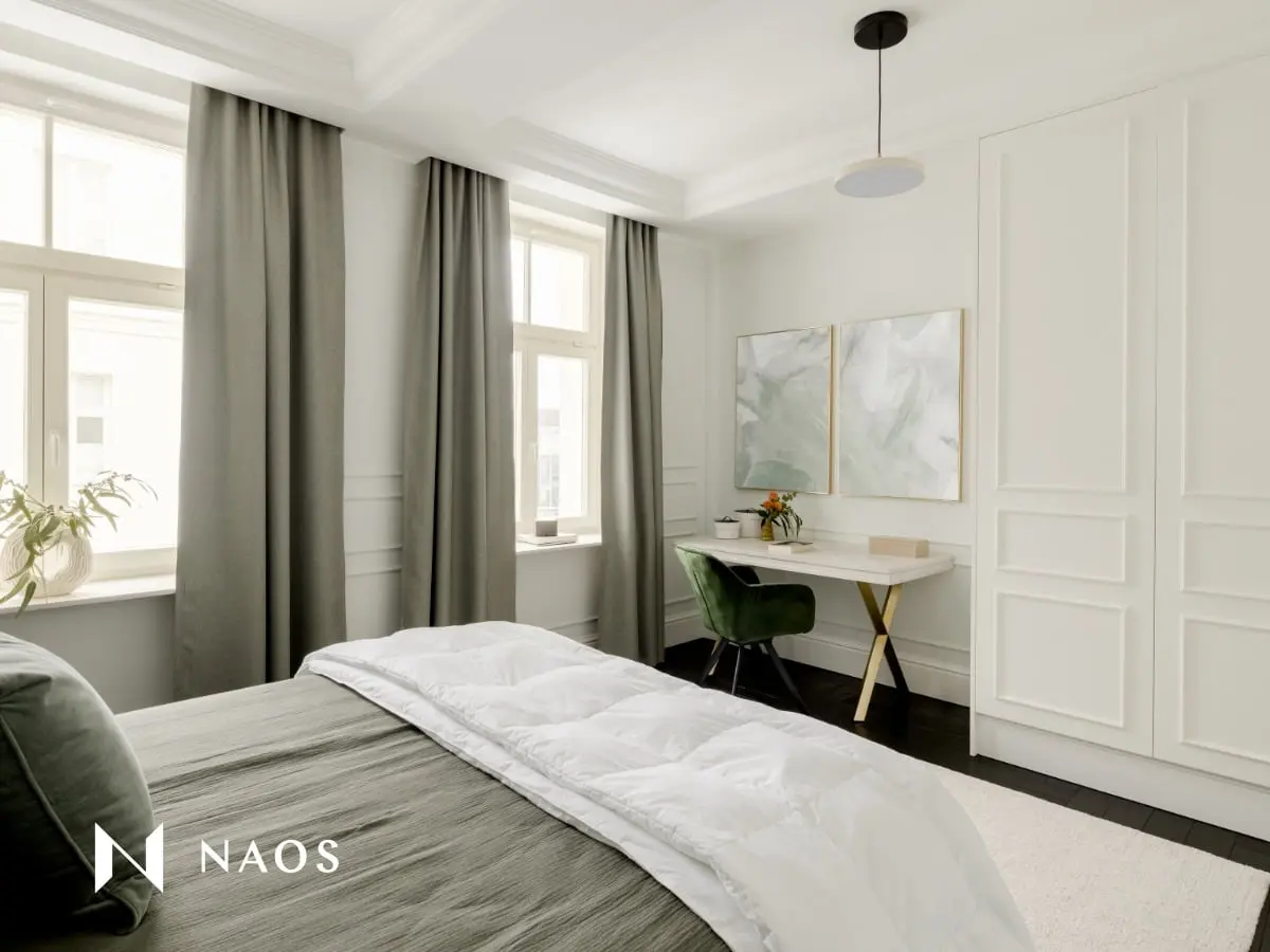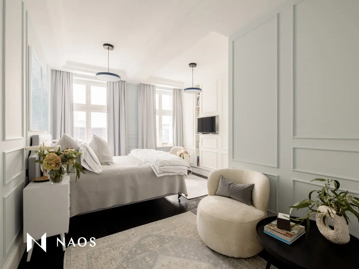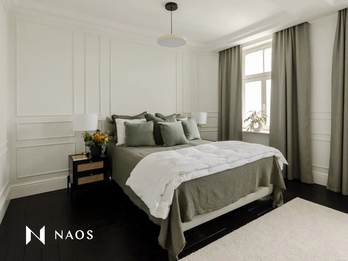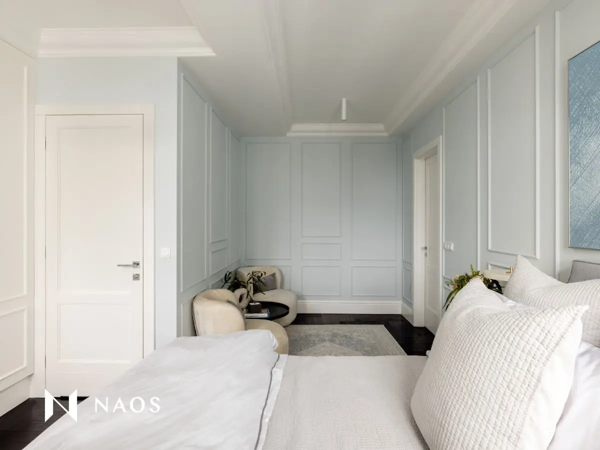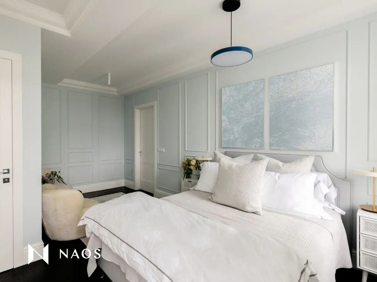 W mieszkaniu znajdują się dwie sypialnie z dużymi łóżkami. Na ścianach sztukaterie, które podkreślają charakter miejsca.