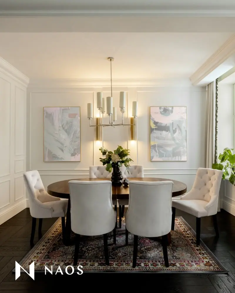 W komfortowym salonie ustawiony został biały modułowy narożnik oraz złoty o szklanym blacie stolik kawowy. W otwartej strefie wygospodarowano również miejsce na prostokątny rodzinny stół jadalniany z sześcioma tapicerowanymi krzesłami. Piękna ciemna podłoga ciekawie kontrastuje z jasnym eleganckim wnętrzem.