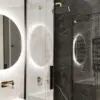 W łazience do wyznaczenia stref wybrano dwa rodzaje marmuru: biały w strefie umywalkowej a w strefie prysznicowej czarny. Szlachetność i styl wnętrza podkreśla złota armatura Hushlab z kolekcji Lukka.