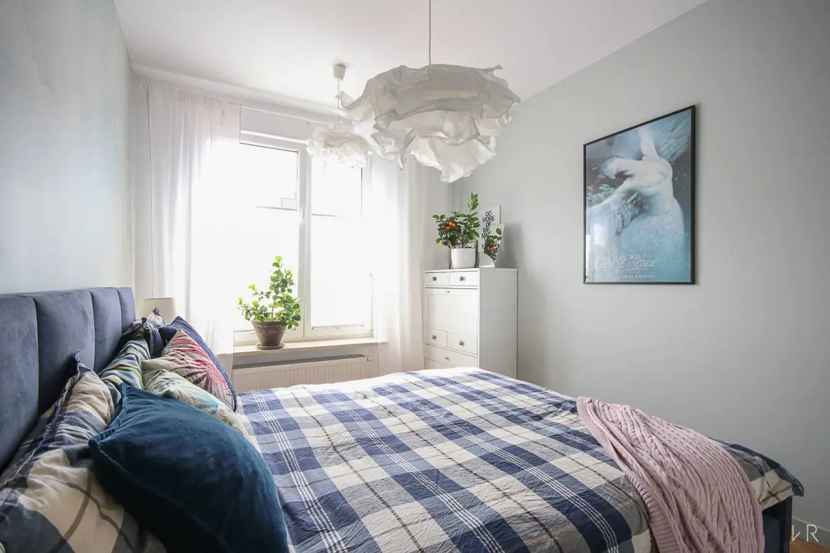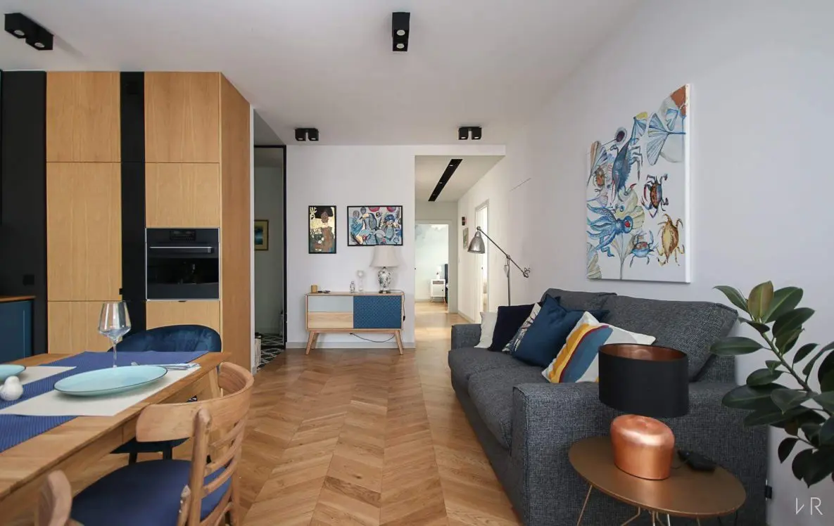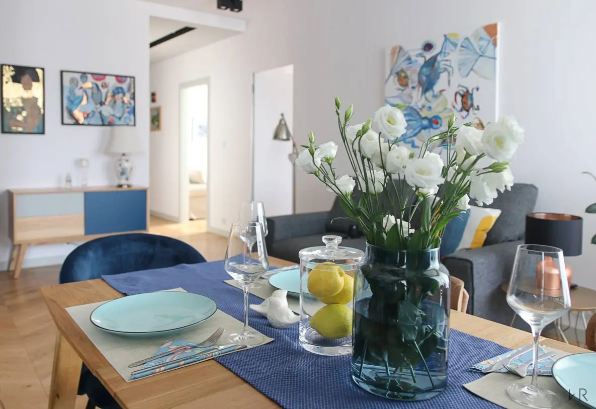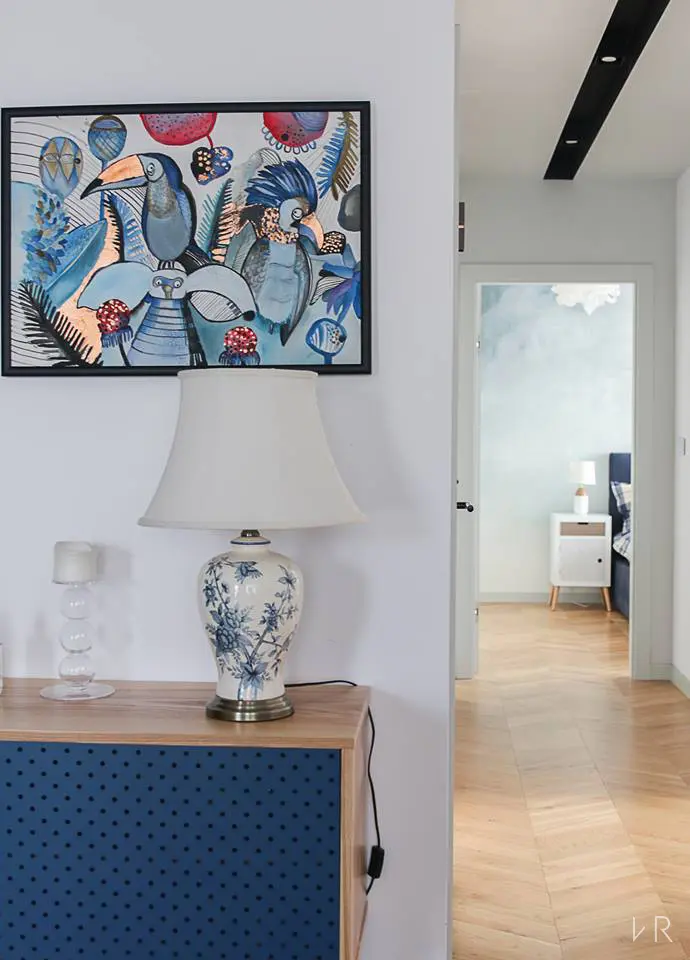 Całe mieszkanie jest spójne, czuć harmonię i ciepło wnętrza. Przestrzeń ozdobiona dobrym wzornictwem oraz kolorowymi grafikami.