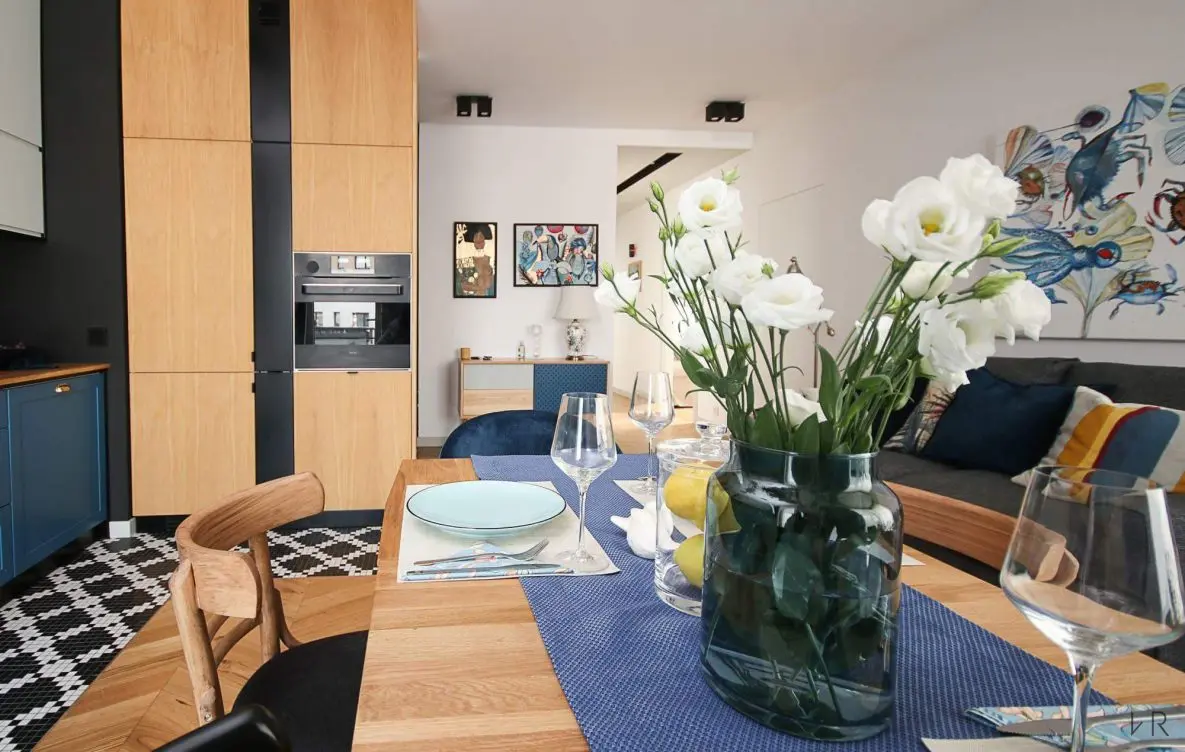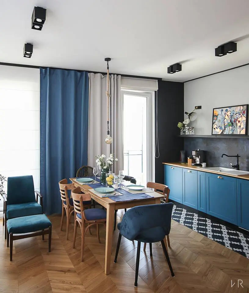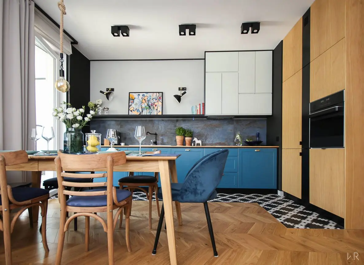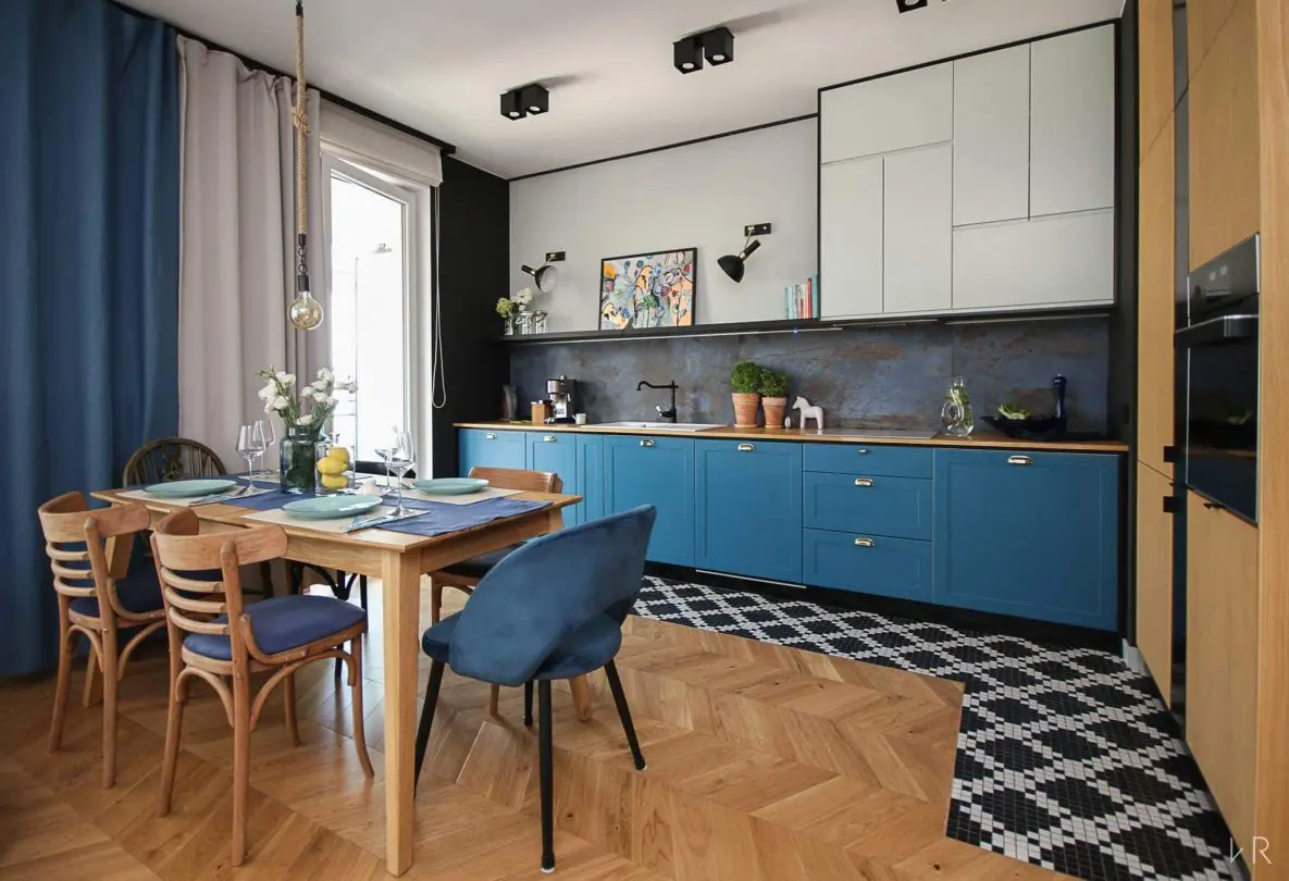 Architekta postawiła na ponadczasową elegancję i w kuchni zagościły w pięknym odcieniu granatu szafki. Zabudowa meblowa w bardzo ciekawy sposób komponuję się z podłogową czarno-białą mozaiką, która łączy się z naturalną drewnianą podłogą, ułożoną w jodłę. W ten sposób podłoga wyraźnie dzieli pomieszczenie na strefę kuchenną i jadalnianą.