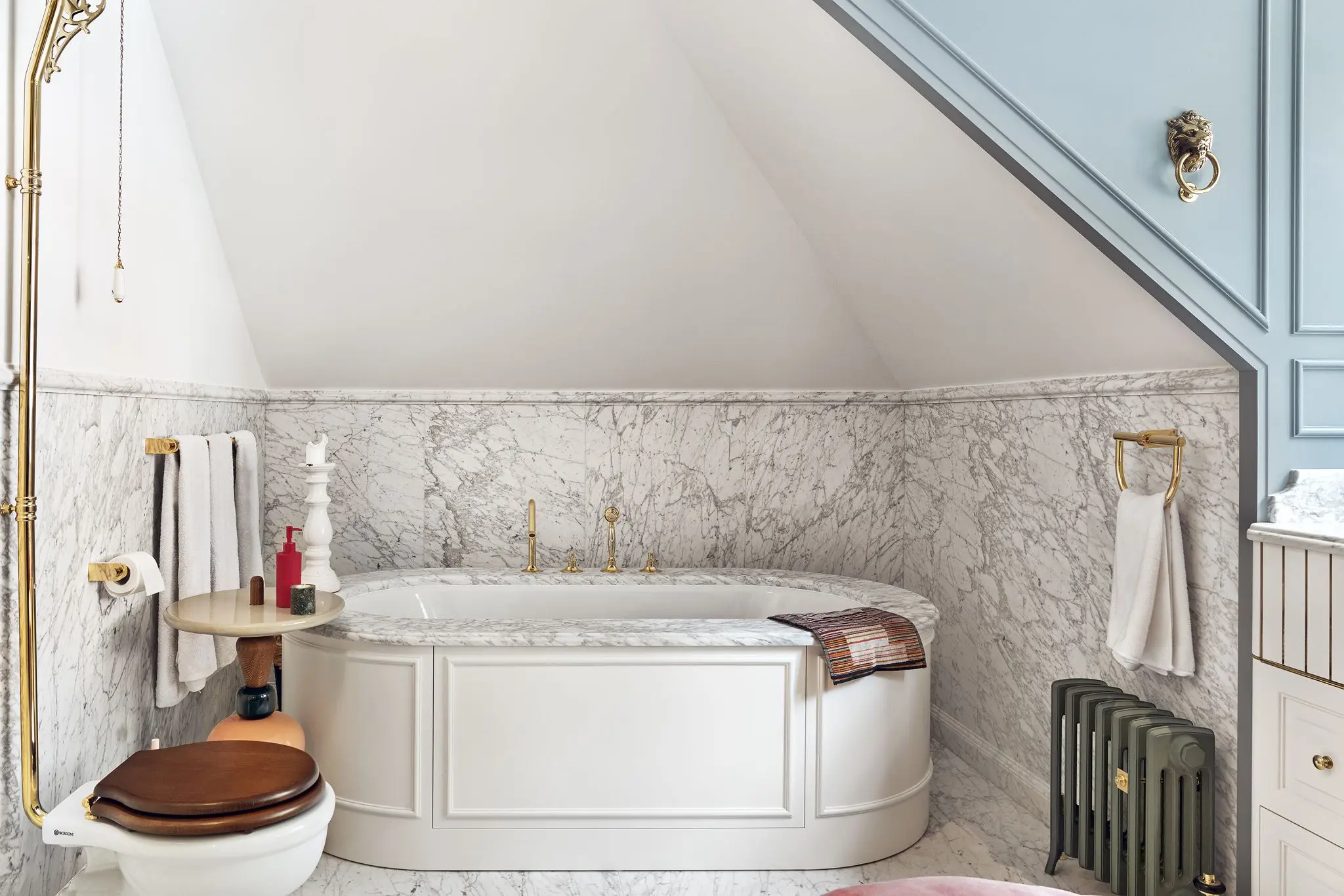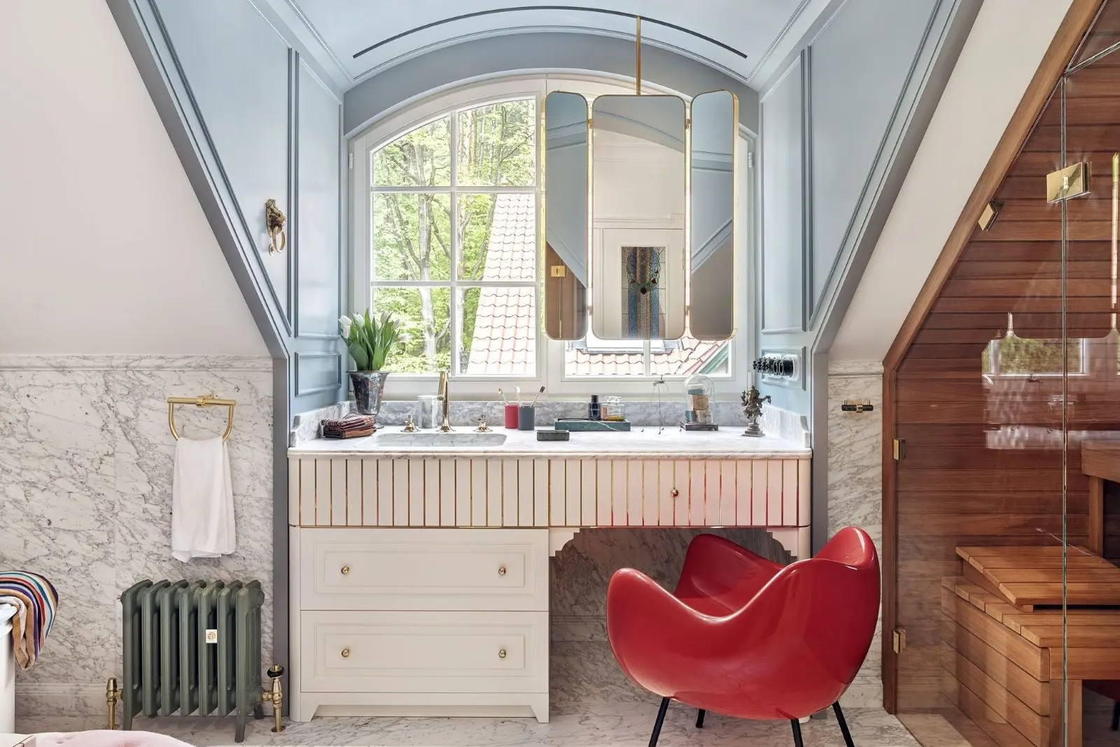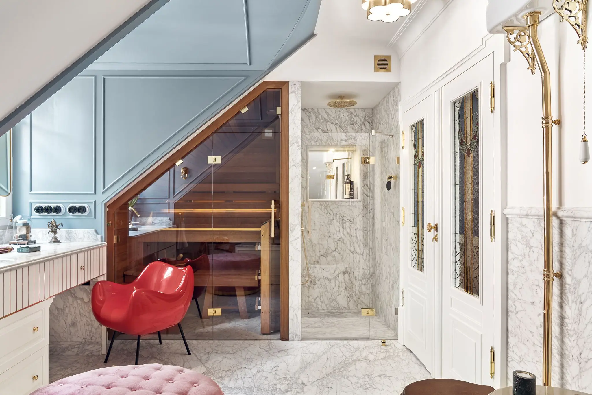 Łazienka to niezwykły, przestronny pokój kąpielowy z wanną, prysznicem oraz sauną. Wykorzystano do jej aranżacji marmur biały z szarym żyłkowaniem, niezwykle biżuteryjną armaturę, złote elementy oraz zaskakujące dekoracyjne dodatki, jak np. czerwony fotel RM58, projektu Romana Modzelewskiego, czy lustro.
