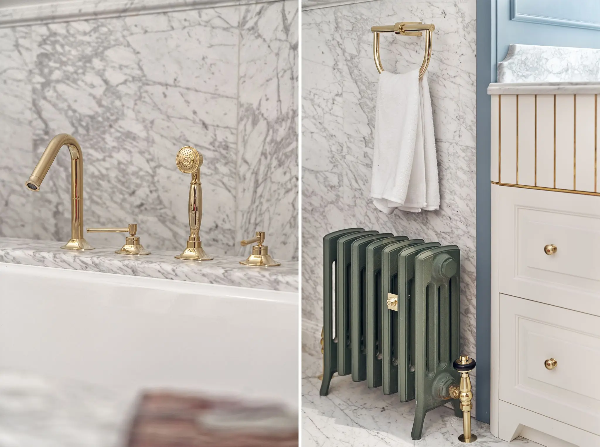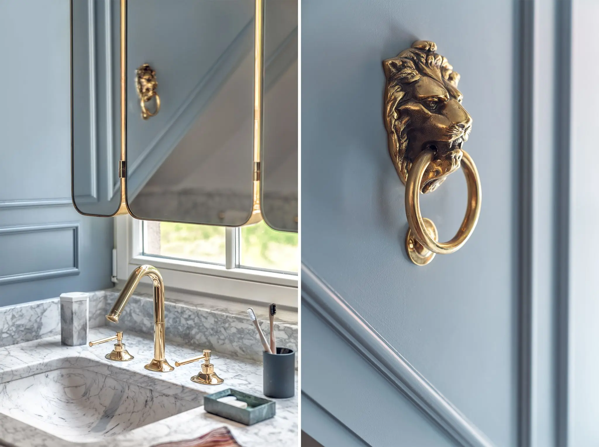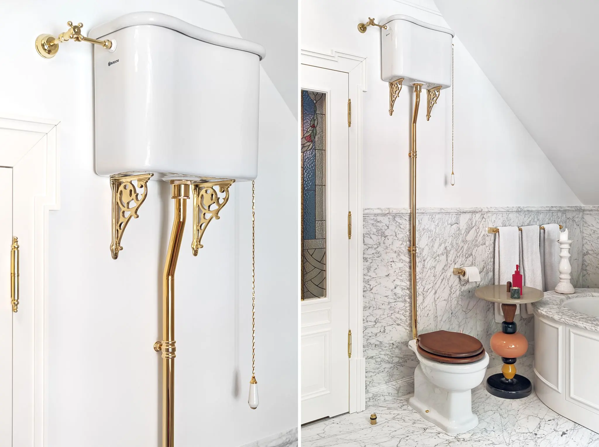 Łazienka to niezwykły, przestronny pokój kąpielowy z wanną, prysznicem oraz sauną. Wykorzystano do jej aranżacji marmur biały z szarym żyłkowaniem, niezwykle biżuteryjną armaturę, złote elementy oraz zaskakujące dekoracyjne dodatki, jak np. czerwony fotel RM58, projektu Romana Modzelewskiego, czy lustro.
