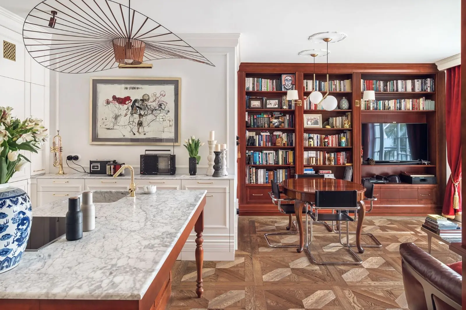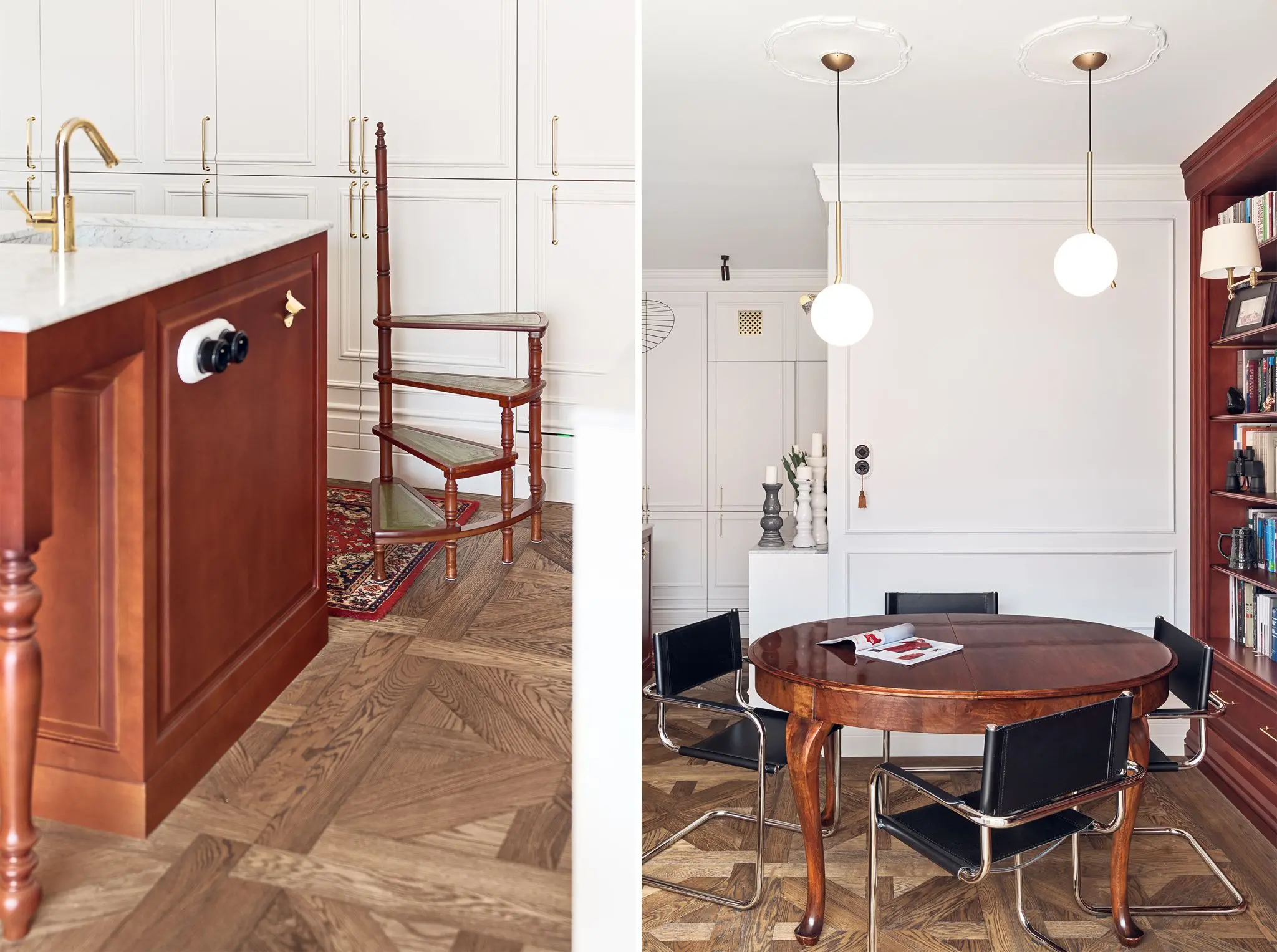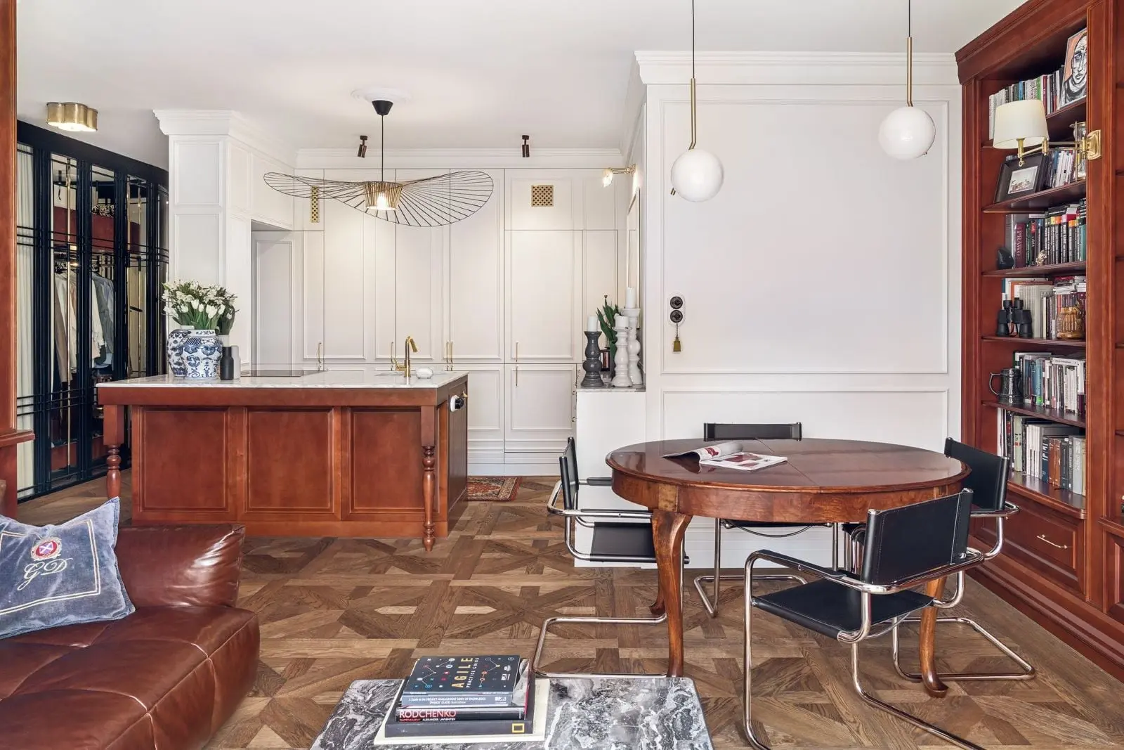 W tym wnętrzu architekci wykorzystali również ikony designu, które wzbogacają jego wizualną stronę i nadają charakterystyczny wygląd. Starannie dobrane meble w stylu vintage stanowią kluczowy element aranżacji. Klasyczny regał, krzesła na metalowych wygiętych nogach, okrągły stół oraz duża drewniana wyspa doskonale oddaje klimat minionych lat. Na szczególna uwagę zwraca kasetonowa drewniana podłoga, która wspaniale łączy się z całą aranżacją dodając jej unikalnego wyglądu. Zwieszane lampy nad stołem to FLOS IC.