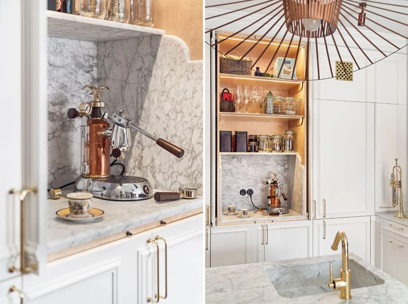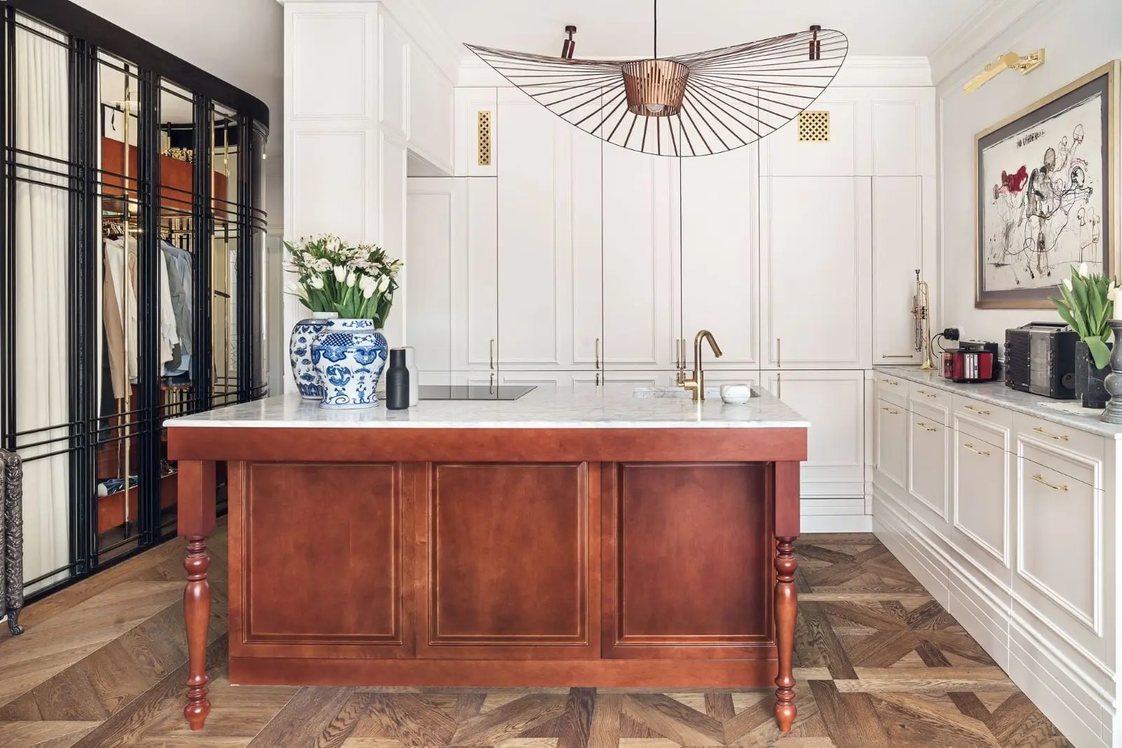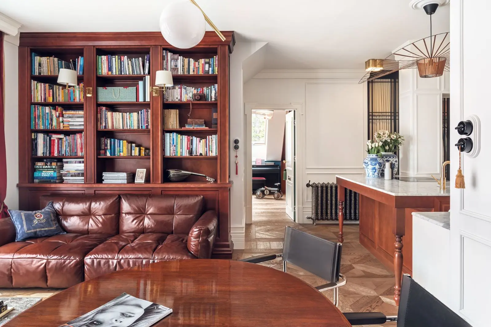 W tym wnętrzu architekci wykorzystali również ikony designu, które wzbogacają jego wizualną stronę i nadają charakterystyczny wygląd. Starannie dobrane meble w stylu vintage stanowią kluczowy element aranżacji. Klasyczny regał, krzesła na metalowych wygiętych nogach, okrągły stół oraz duża drewniana wyspa doskonale oddaje klimat minionych lat. Na szczególna uwagę zwraca kasetonowa drewniana podłoga, która wspaniale łączy się z całą aranżacją dodając jej unikalnego wyglądu. Zwieszane lampy nad stołem to FLOS IC.