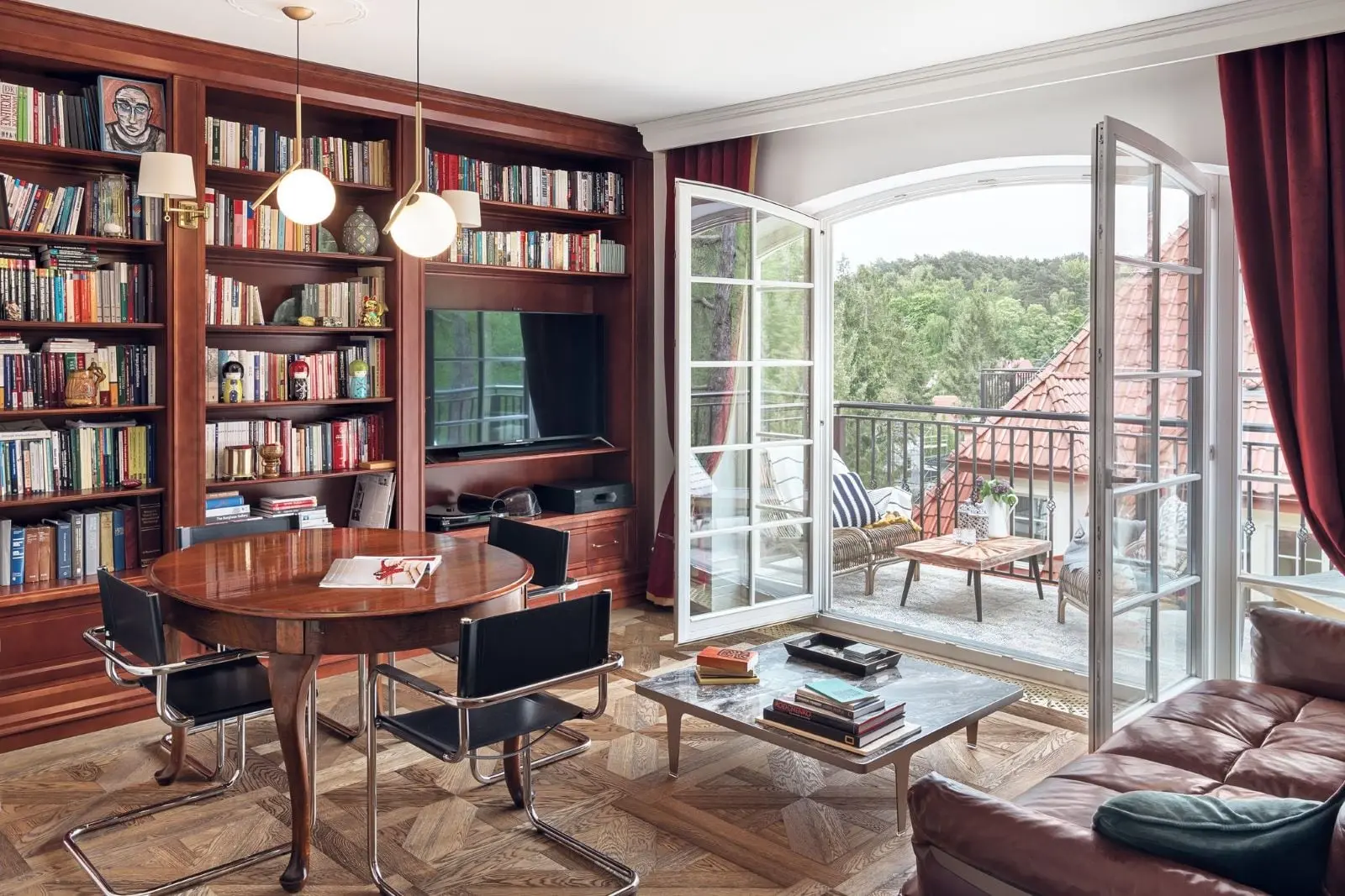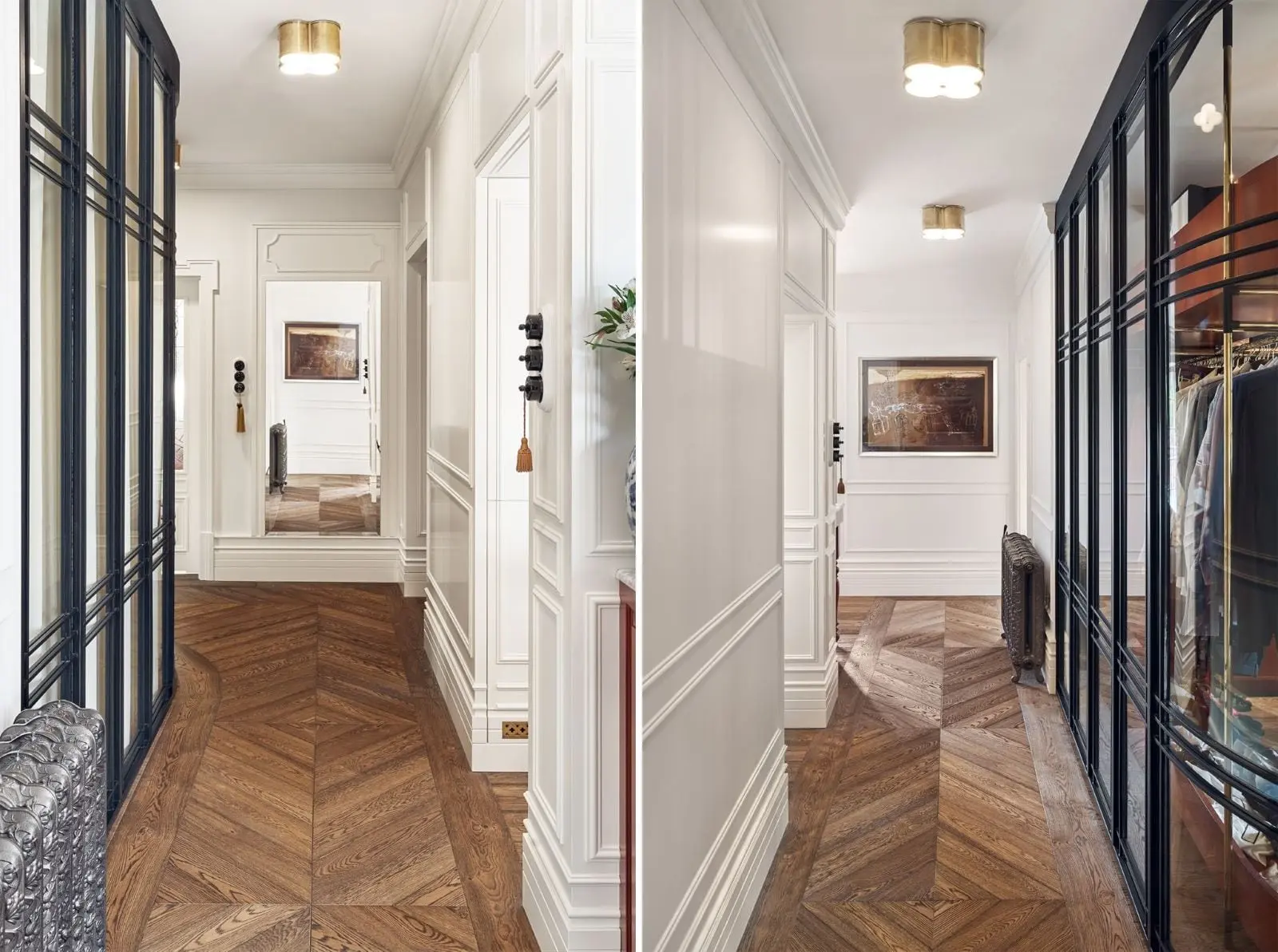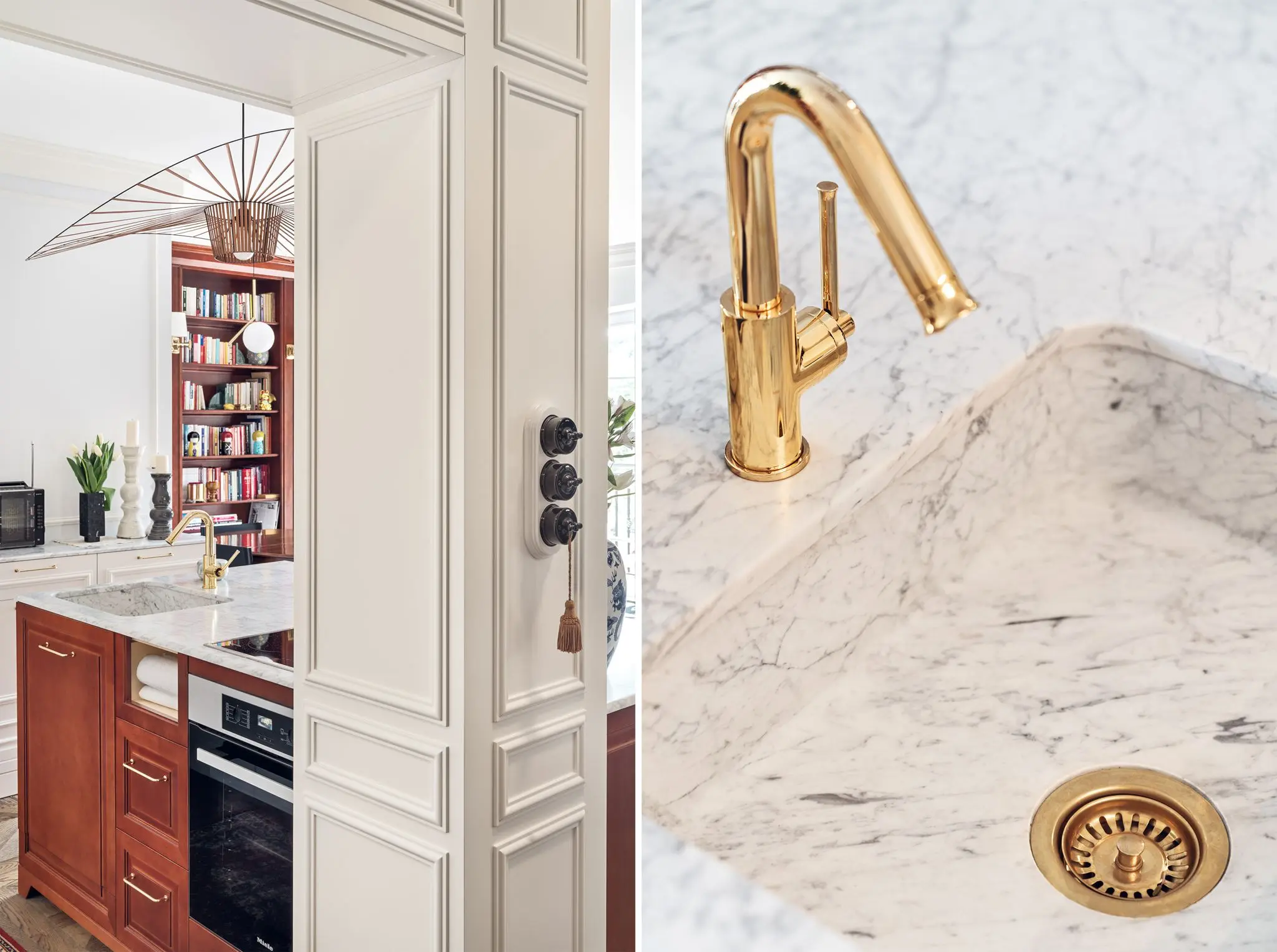 Nie mogło w tym mieszkaniu zabraknąć również sztukaterii na ścianach. Jako element dekoracyjny mają długą historię w architekturze i designie wnętrz, często kojarzą się z budynkami o charakterze klasycznym czy zabytkowym. Ich obecność nawiązuje do tradycji i stylów panujących w przeszłości.