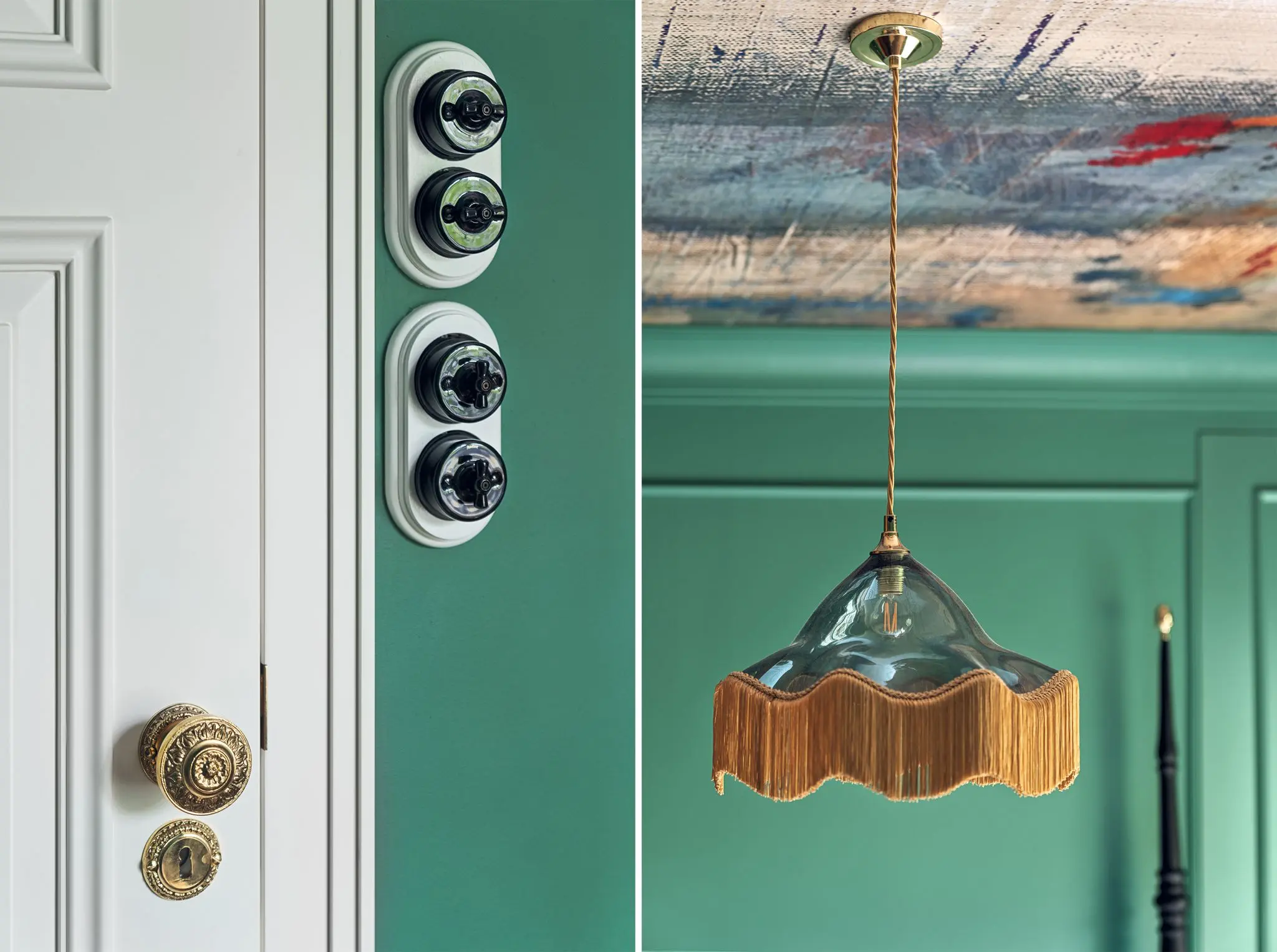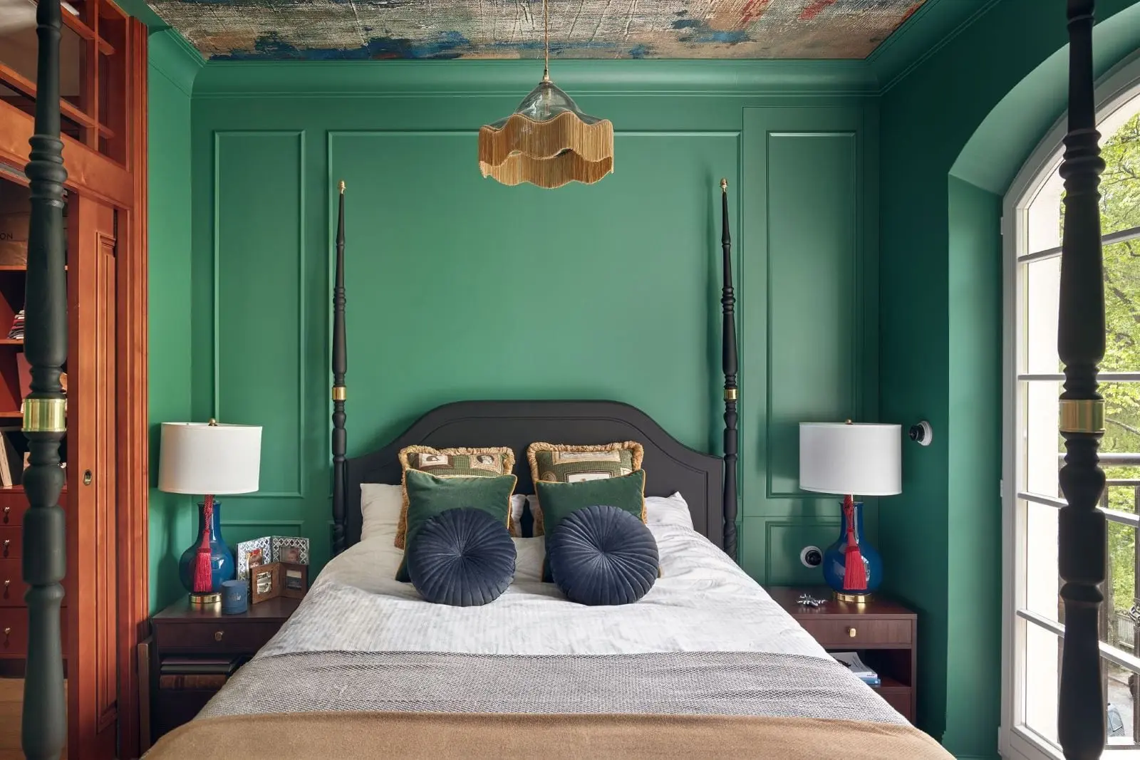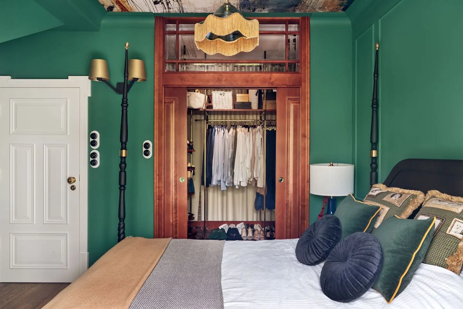 Niezwykły klimat panuje również w sypialni inwestorów. Kolor zielony kojarzy się nam z harmonią, spokojem i oczywiście naturą. Budzi zaufanie i nadaje wnętrzu relaksujący klimat. Te ściany są niezwykłym tłem dla całej aranżacji. Na uwagę zasługuje tu również sufit z postarzaną tapetą. Sypialnia to przestrzeń, w której wybór kolorów i detali ma ogromne znaczenie dla komfortu i dobrego samopoczucia.