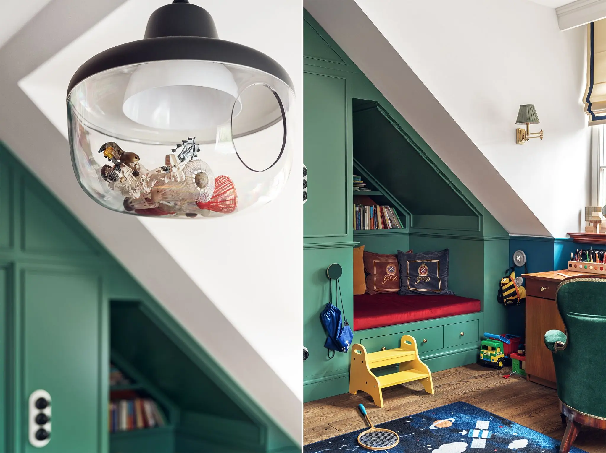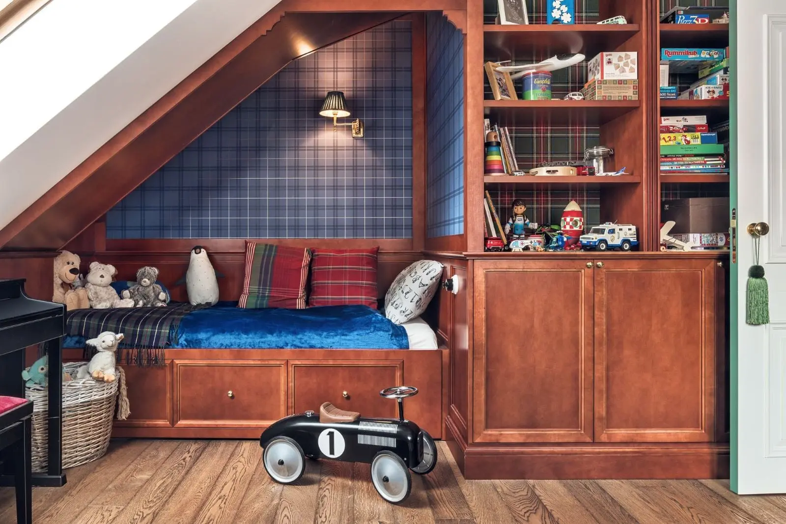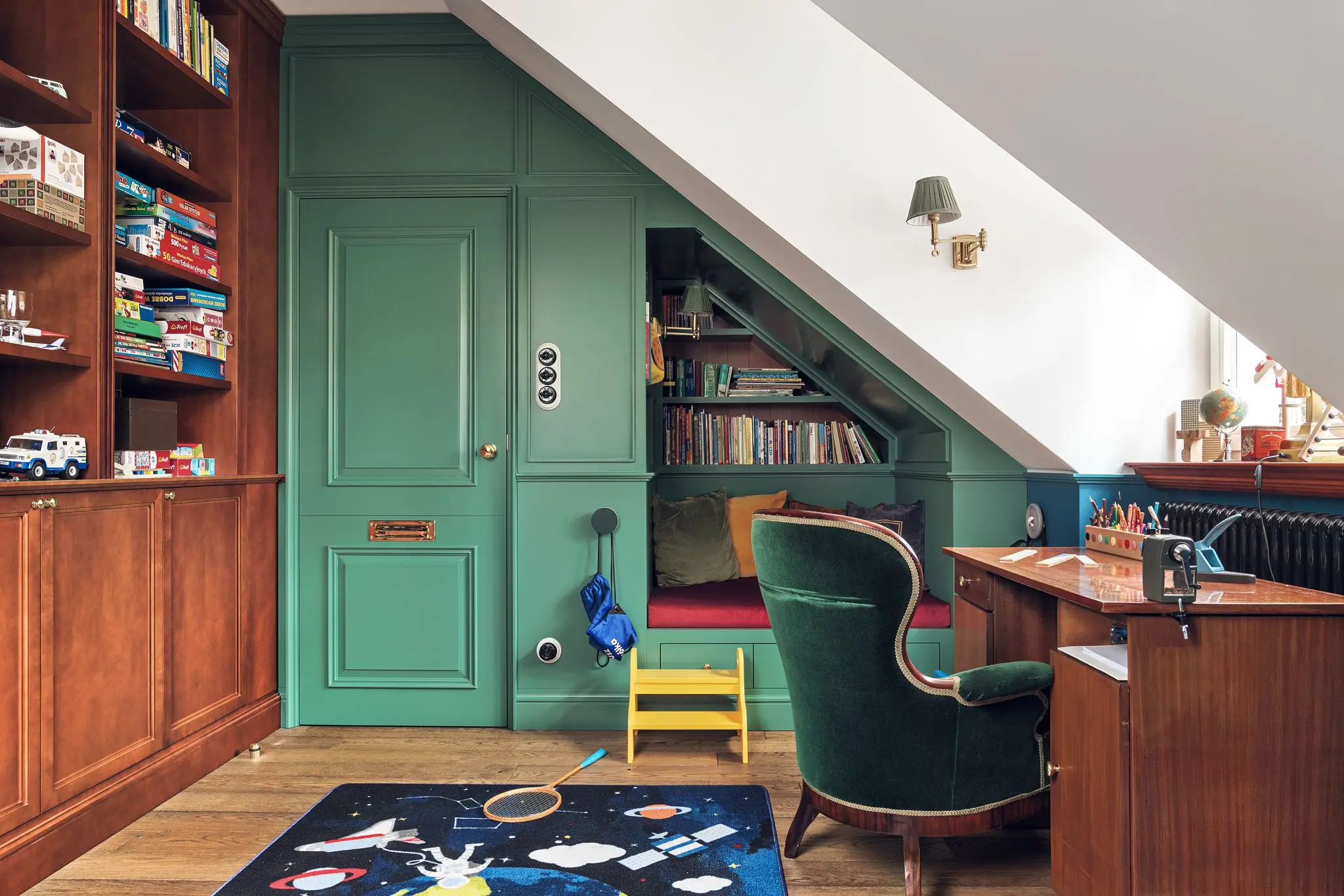 Pokój dziecięcy ze skosami utrzymany również w klimacie stylu vintage. Ciemnozielona ściana znakomicie współgra z orzechowym kolorem mebli. Pod skosami architekci wydzieli kącik do czytania. Wygodne poduszki, pledy i półki na książki tworzą przestrzeń, o której marzy każdy mały odkrywca. Biurko oraz fotel stanowią znakomitą ozdobę tego pokoju. Podczas projektowania nie zbagatelizowano, ani roli detali, faktur czy barw.