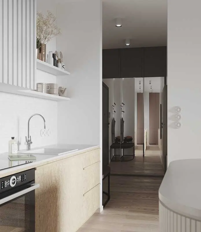 Mieszkanie o powierzchni 50m2, posiada spektakularny widok na cały Gdańsk. Architekci chcieli więc nawiązać we wnętrzu do architektury miasta, którą można podziwiać z okna. Kolorystyka opiera się na pastelowych odcieniach beżu, szarości, złamanej bieli oraz akcentu w postaci terakoty w różowo-brzoskwiniowym odcieniu. Przełamaniem subtelnej kolorystyki jest czerń, która nadaje wnętrzu charakteru. Wprowadzenie do aranżacji terakoty, zainspirowane jest dachówkami kamienic, widocznymi z okien mieszkania. Wyspa kuchenna na planie elipsy ze żłobionymi frontami, nawiązuje do gdańskiego modernizmu. Natomiast kultowe krzesła Fameg o wyplatanych siedziskach i oparciach, przywodzą na myśl klimat nadmorskich kawiarni. Ważną rolę we wnętrzu odgrywa drewno, które wprowadza faktor przytulności. Szczególną uwagę przykuwają fronty kuchenne, pokryte fornirem czeczotowym o pięknym rysunku. Strefa dzienna jest jasna i słoneczna za sprawą dużych okien, a zastosowanie przeszkleń pomiędzy salonem i sypialnią dodatkowo optycznie powiększa tą część mieszkania.