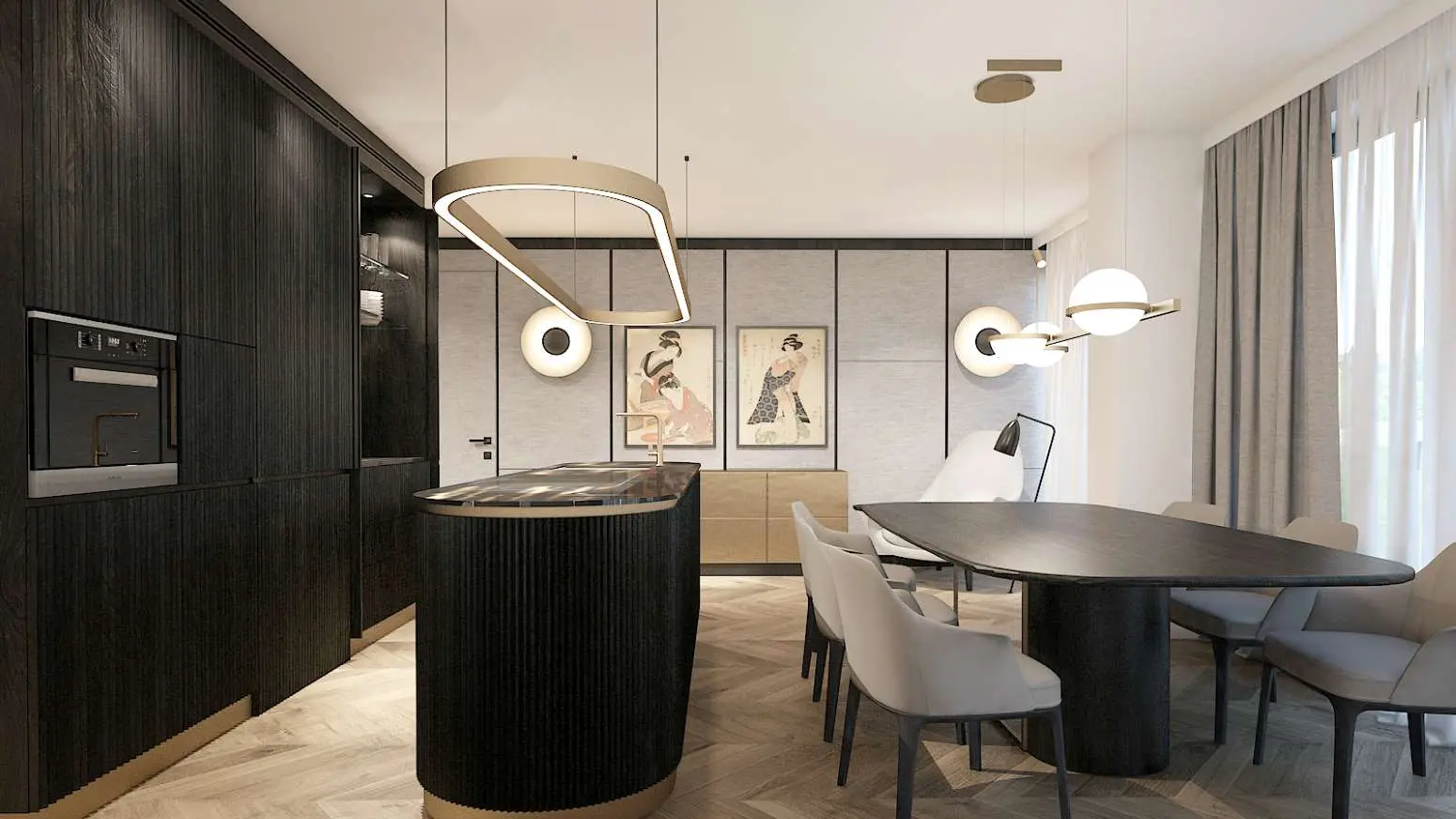 Elegancka zabudowa meblowa kuchni wtapia się w część salonu. Owalna wyspa z marmurowym kamiennym blatem wprowadza miękkie linie do wnętrza. Została przyozdobiona złotą również owalną lampą. Ciemne fronty meblowe z detalami mosiądzu, a także inne meble w mieszkaniu zostały wykonane z forniru dębowego w kolorze głębokiego brązu. Tworzy to niezwykle harmonijny i konsekwentny projekt całego mieszkania.