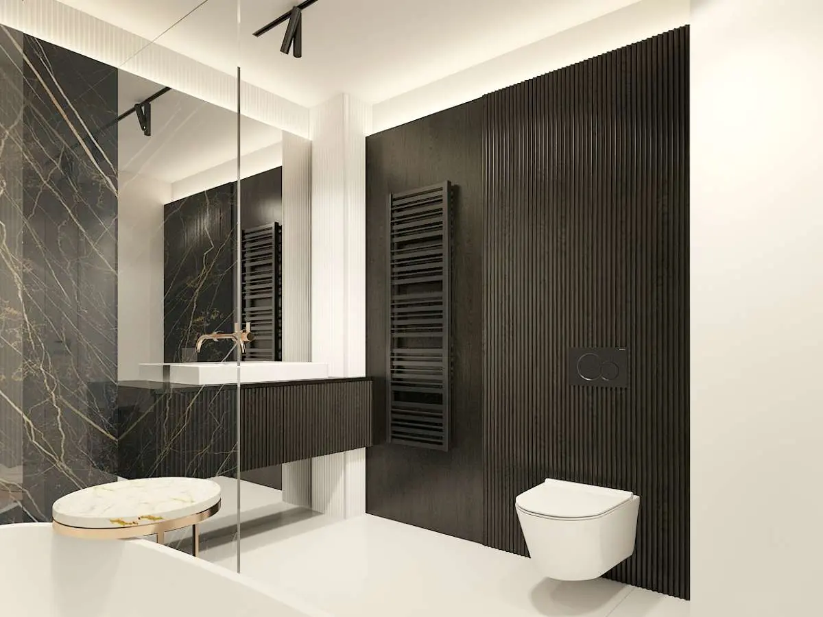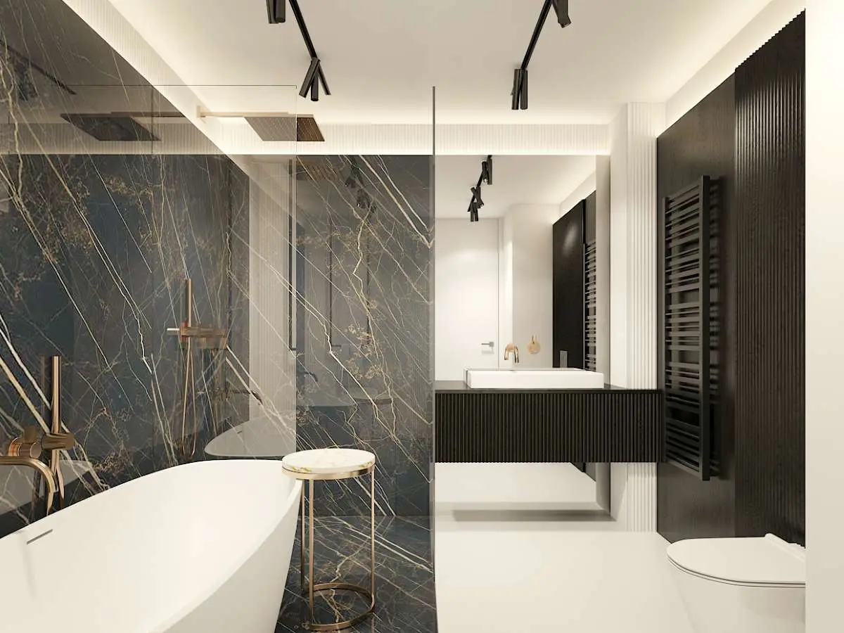 Na ścianach znalazł się czarny ze złotym żyłkowaniem spiek kwarcowy, który dodaje elegancji oraz nadaje bardzo wyrafinowany charakter łazience. Dla wzmocnienia efektu, łazienki wyposażono w ciemnobrązowe meble oraz złote baterie. Dzięki temu całość wnętrza prezentuje się wprost niepowtarzalnie i bardzo wysmakowanie, co dodatkowo podkreśla techniczne, ale efektowne oświetlenie.