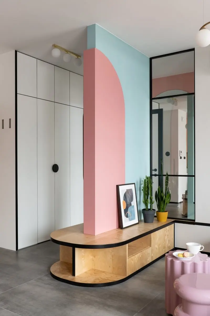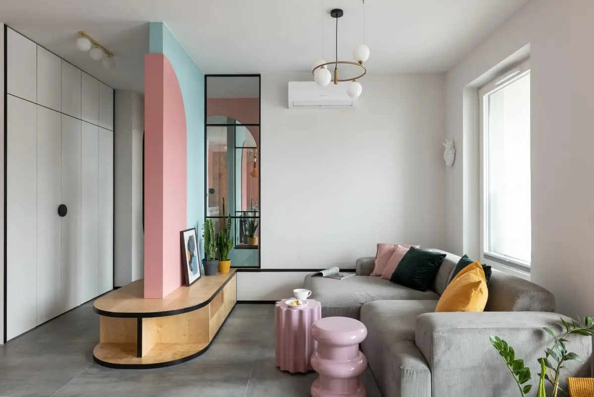 Mieszkanie zaprojektowane przez pracownię KODO powoduje uśmiech od samego progu. Jak podkreślają projektanci, wnętrze przywołuje wspomnienia baru mlecznego serwującego lody truskawkowe o smaku nieba, nawiązuje do architektury Bauhausu oraz eklektycznych butików słynnych domów mody. Tutaj patrzy się na świat przez różowe okulary, odkrywając jego pastelową słodycz, radosną aurę i tętniącą beztroskę. Pomimo silnej obecności Millennial pink, zadbano o równowagę barwną. Tło dla aranżacji strefy dziennej stanowi złamana biel, będąca rodzajem „czystego płótna” na którym maluje się niezwykła pastelowa aranżacja. Urok projektu tkwi w detalach i oryginalnych, a zarazem funkcjonalnych rozwiązaniach. Dobrym przykładem jest stół jadalniany połączony z wyspą, tworzące geometryczny monolit. Ścianę szczytową wzbogacają łuki o różnej wysokości, a w jeden z nich wkomponowano biurko.
