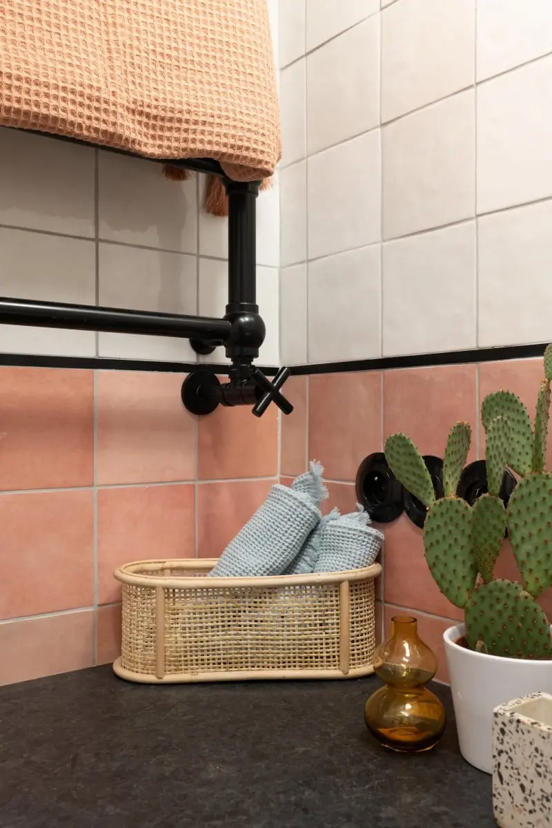 Eklektyzm w stylu dolce vita to najlepszy opis projektu pracowni KODO. Nie inaczej jest w łazience. Tutaj łososiowy odcień spotyka się z bielą i złotymi detalami, a ramy wyznacza czerń w postaci profili, blatu i dekoracyjnego grzejnika. Różowe płytki w formacie małych kwadratów i dużej różnorodności tonacji, tworzą lamperię do połowy wysokości pomieszczenia. Białe płytki, znajdujące się powyżej, zostały „zamknięte” przez cienkie, czarne pasy. Znalazły się tutaj też dwa odcienie lastryko: jasny szary na podłodze oraz antracytowy na blacie szafki. Klamrą spinającą styl łazienki z resztą mieszkania są detale w klimacie retro: włączniki oraz kinkiet przy lustrze. Kropkę nad i stanowi złota armatura.