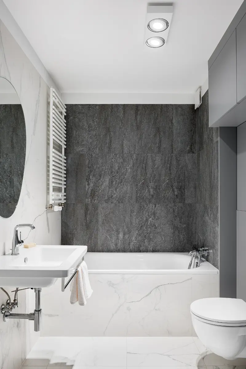 W małej łazience architekci zastosowali płytki imitujące dwa rodzaje kamienia. Dzięki zaprojektowanej na wymiar zabudowie, udało się uniknąć niepotrzebnego zagracenia. Wszystkie przedmioty codziennego użytku, włącznie z pralką, zostały tam skrupulatnie schowane. Tym samym w łazience zagościł pożądany puryzm. Relaks w takim miejscu staje się codzienną przyjemnością a żaden zbędny bodziec nie jest w stanie go zakłócić. Ten projekt udowadnia zatem, że nawet w mikro łazience jest możliwe wyczarowanie domowego spa.