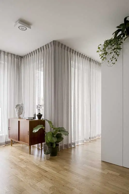 Znajdujące się w mieszkaniu lniane firany, pełniące rolę również zasłon, otulają przestrzeń i nadają jej pierwiastek domowego ciepła. Tym samym minimalistyczna kawalerka zyskała na przytulności. Ich prawie transparentna faktura nie zabiera wnętrzu cennego światła.
