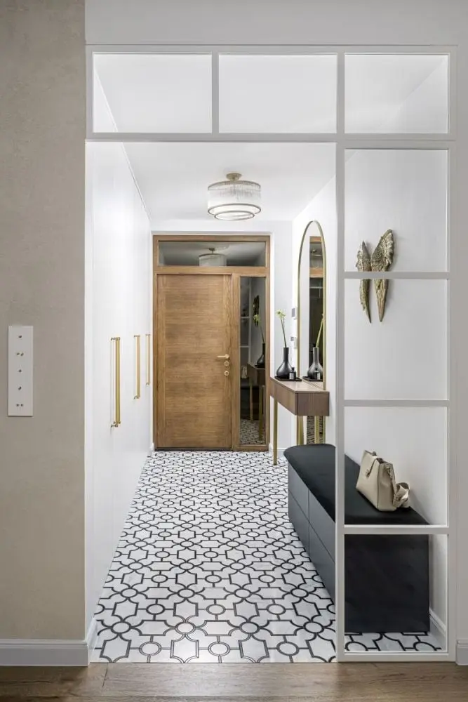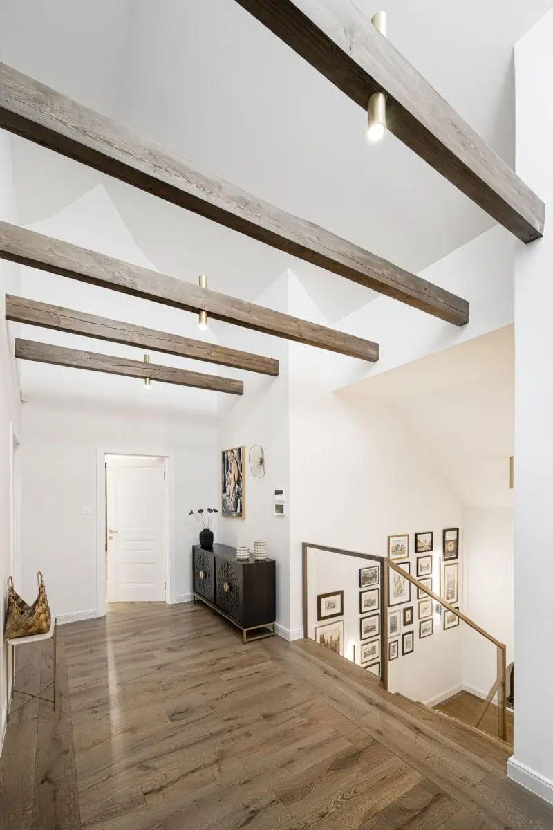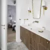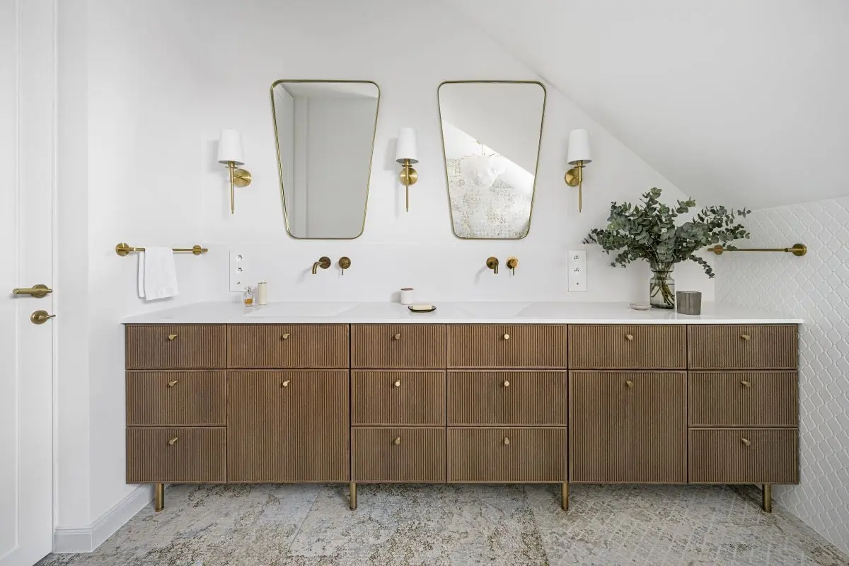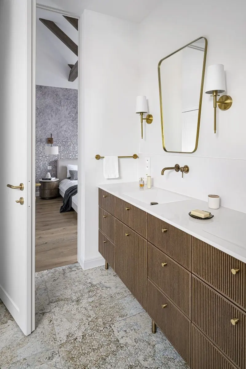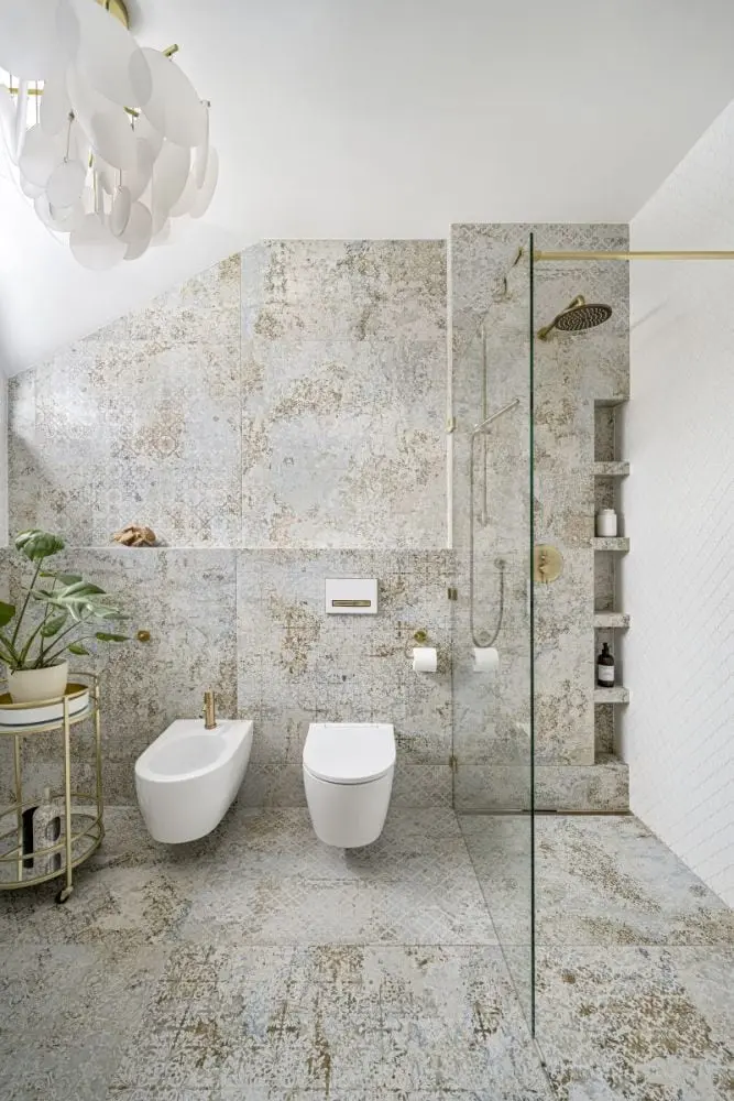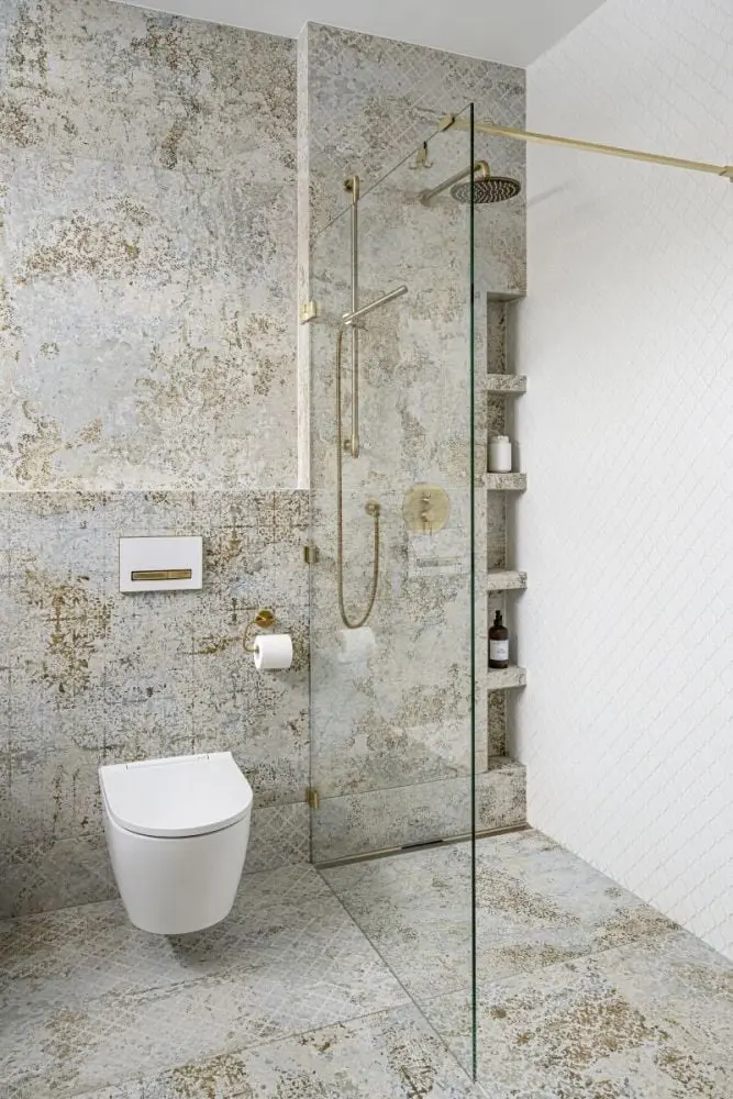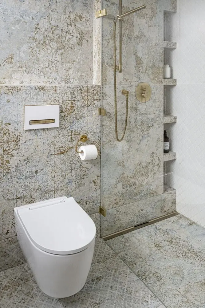 – Inwestorom zależało przede wszystkim na wysokiej jakości materiałach. Nie chcieli iść na kompromisy. Sama stylistyka wnętrz nie jest więc jednoznacznie określona. Poprzez zastosowanie mosiężnych dekoracji, sztukaterii, kwarcytu, czy welurowych tkanin lawiruje ona pomiędzy stylem modern classic a przytulnym stylem południowym – śródziemnomorskim. Ten ostatni nawiązuje do hiszpańskich i portugalskich wnętrz, w których drewno przeplata się z kamieniem, różnorodnymi tkaninami oraz mnogością wzorów – tłumaczy założenia projektu arch. Agnieszka Musiał-Chmielnik, właścicielka Musiał Studio i Ambasadorka marki Geberit.