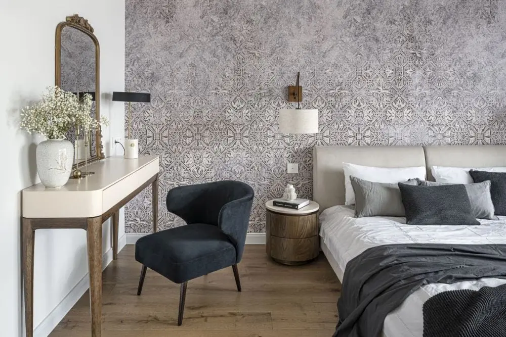 Także główna sypialnia właścicieli została zaaranżowana jako przestrzeń wielofunkcyjna, a mianowicie – master bedroom. Łączy się więc ona bezpośrednio z oddzielną łazienką i garderobą. Stąd beżowe, tapicerowane łóżko zwrócone jest w stronę wysokiej zabudowy z lustrzanymi frontami, która sprytnie kamufluje z obu swych stron drzwi do wspomnianych pomieszczeń. Znalazło się tu także miejsce na elegancką toaletkę ze zdobionym lustrem. Głównym akcentem stylistycznym jest tu jednak mural, który zdobi całą ścianę za wezgłowiem łóżka. Wzorzysty, o stonowanych barwach przyciąga uwagę i po prostu zachwyca.