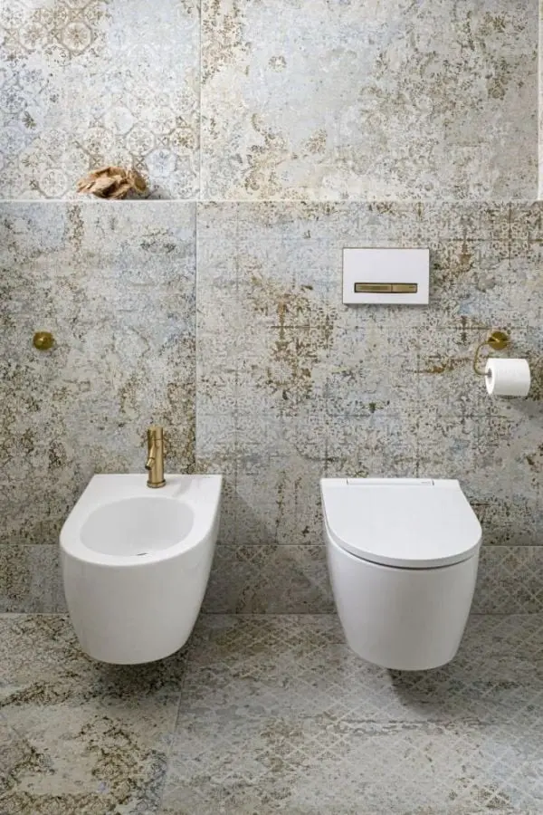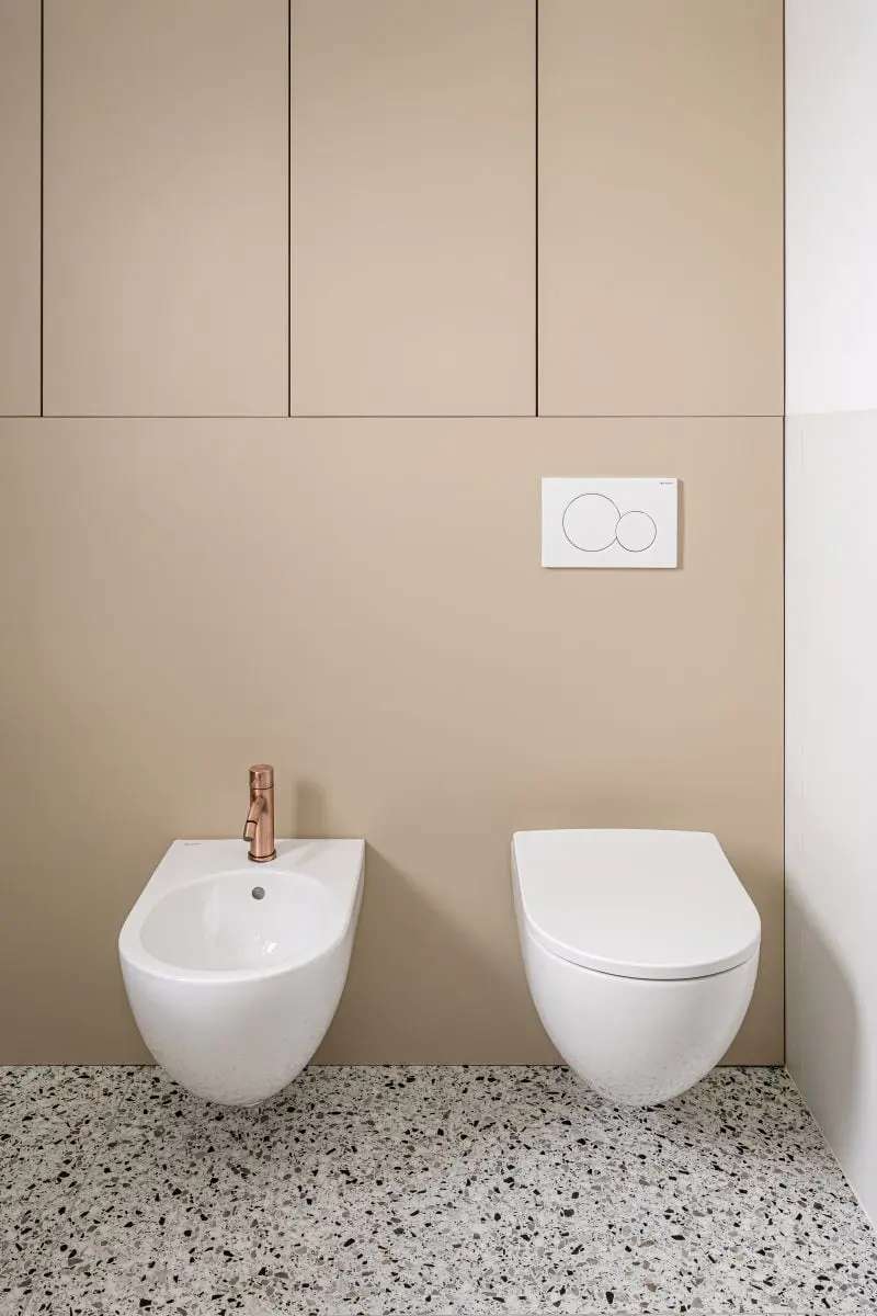 Dbałość o szczegóły widać także w wystroju łazienki dla dzieci. Jest ona bardziej nowoczesna, wzorzysta, a przez to też dynamiczna. Okładziny terazzo zostały tu połączone z płytkami w kształcie cegiełek i dopełnione czarnymi oraz miedzianymi akcentami. W strefie WC komfort i wygodę zapewnia seria Geberit Acanto. Misę WC i bidet z tej serii zamontowano na stelażu podtynkowym Geberit. Uwagę zaś przyciąga niezwykle efektowny przycisk Geberit Sigma01. Tak skompletowany zestaw z oferty jednego producenta jest gwarancją trwałości i bezpieczeństwa użytkowania przez lata.