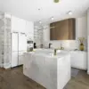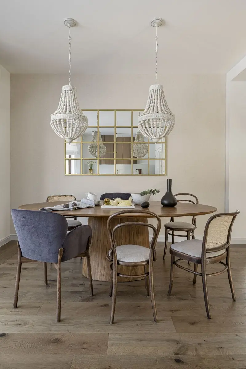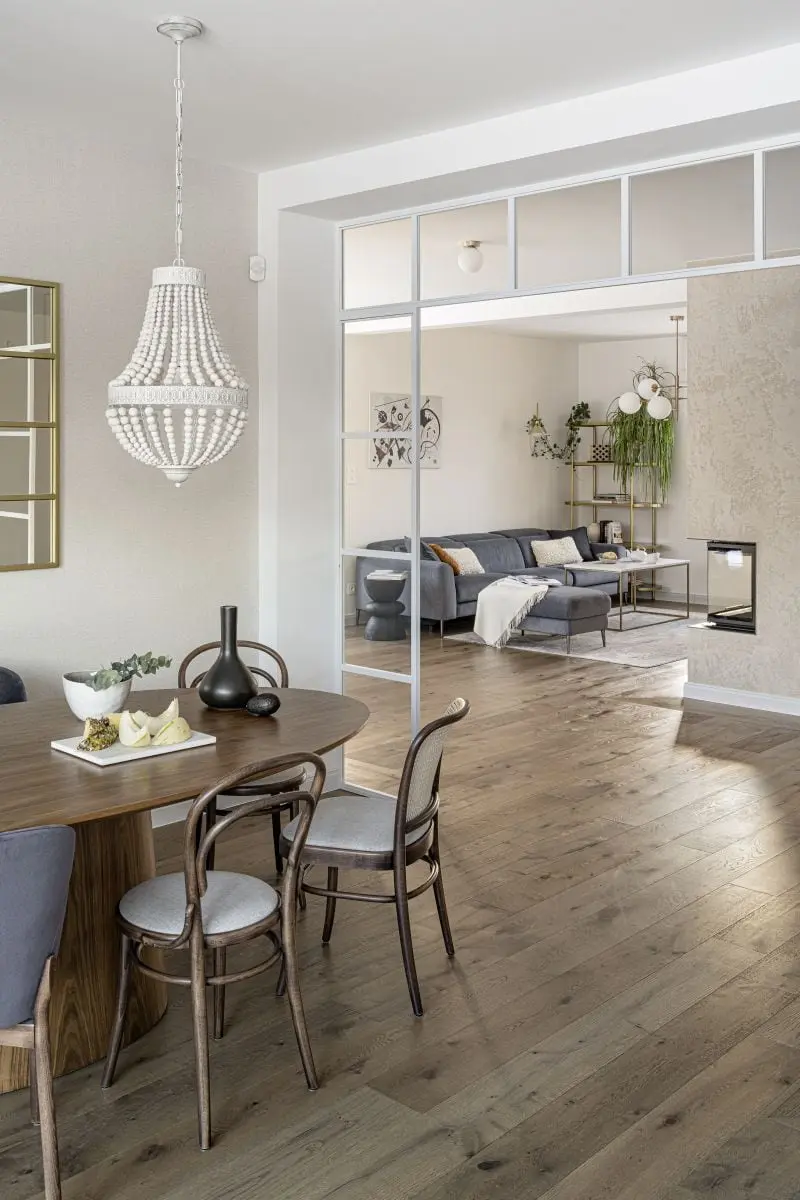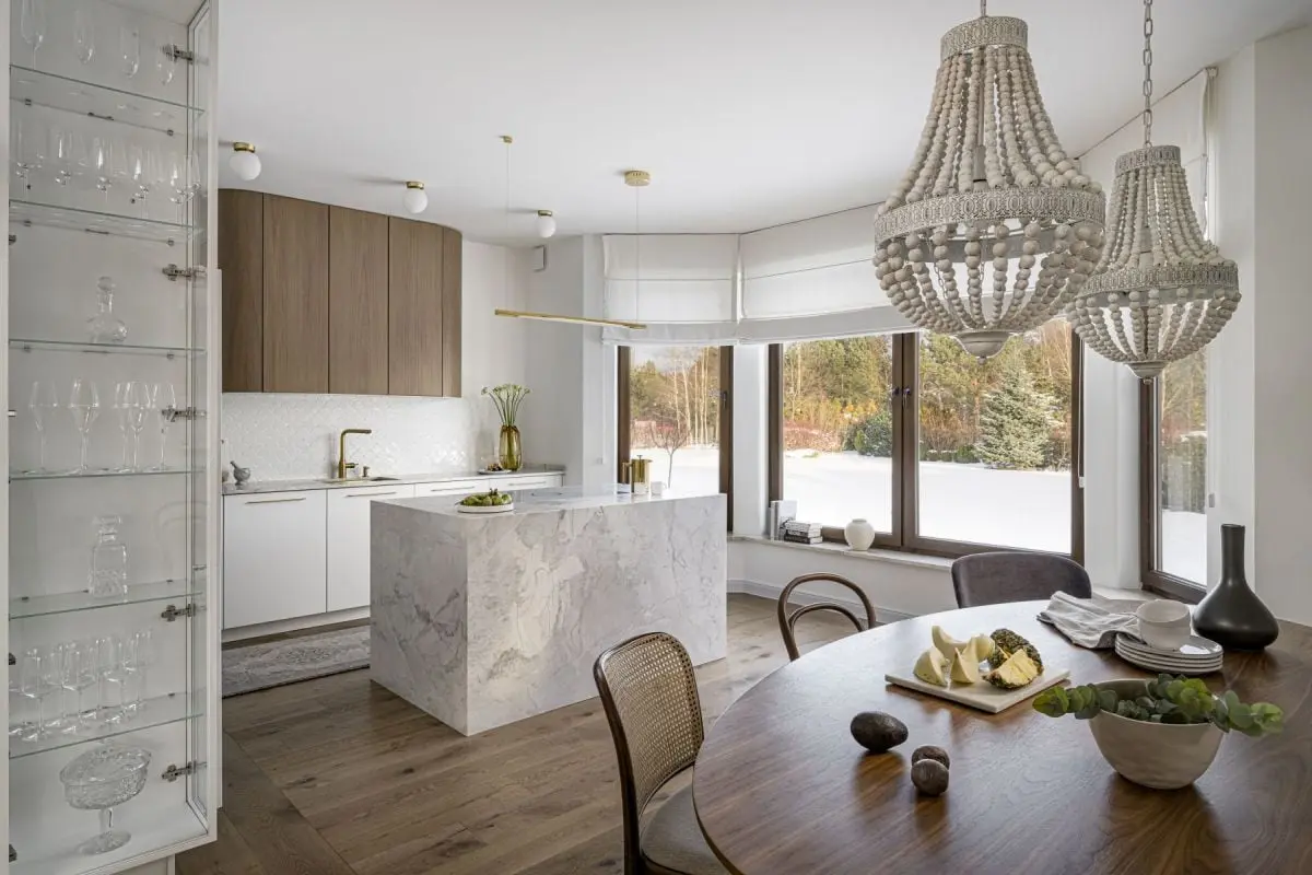 Urzeka także sama koncepcja wystroju poszczególnych pomieszczeń. Otwarta strefa dzienna na parterze tworzy dwie, niezależne od siebie części – kuchenną oraz salonową. Dzięki temu aneks kuchenny z jadalnią są połączone ze strefą wypoczynku, ale nie przenikają się, pozwalając cieszyć się funkcjonalnością i przeznaczeniem każdej z nich. Biała kuchnia to przestrzeń czysta, elegancka, która nie dominuje nad pomieszczeniem. Wspominana już szafka w kolorze drewna dodaje jej salonowego charakteru, a funkcjonalna wyspa, która zdobi okładzina z naturalnego kwarcytu, wyznacza granicę między strefą przygotowywania posiłków a jadalnią. Tą ostatnią organizuje nowoczesny stół z okrągłym blatem, przy którym ustawiono trzy rodzaje krzeseł – eleganckie, tapicerowane w szarej tkaninie oraz lekkie w odbiorze, z charakterystycznymi giętymi formami oraz wiedeńską plecionką na siedziskach i oparciach.
