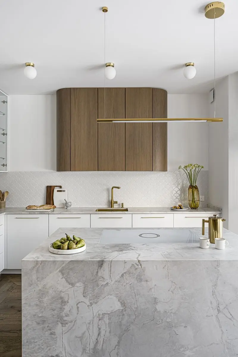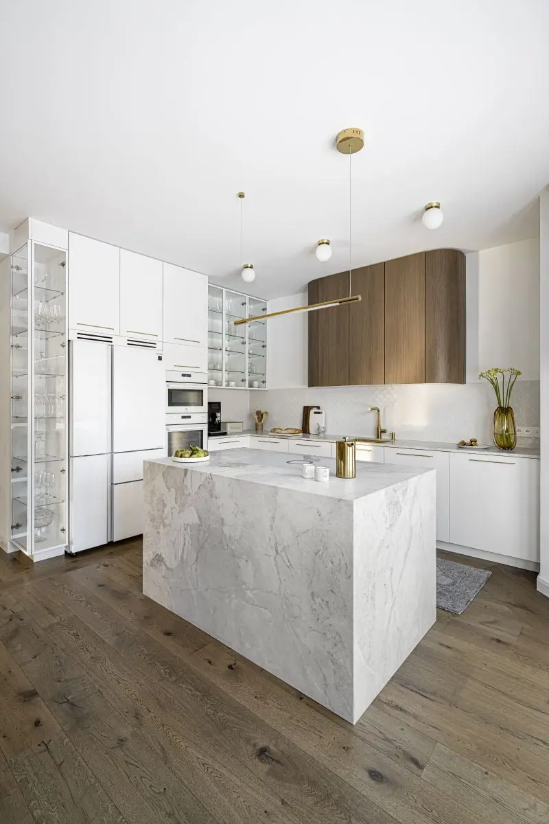 Na kompromis nie poszła także sama architektka, która ze szczególną starannością pogodziła dwie z pozoru zupełnie różne stylistyki. W efekcie eleganckie wnętrza są zarazem ciepłe i przytulne. Wymagało to jednak bardzo przemyślnych rozwiązań estetycznych. I tak np. obłe formy drewnianej szafki wiszącej pięknie prezentują się na tle białej mozaiki w kuchni, a dekoracyjne lampy, wyglądające niczym wykonane z nadmorskich kamyczków, doskonale korespondują z lekką formą fornirowanego stołu w jadalni. A takich smaczków we wnętrzu odnajdziemy o wiele więcej. Zastosowano tu bowiem całe spectrum struktur, faktur i wzorów rodem znad Morza Śródziemnego, które ubrano w eleganckie, obłe formy typowe dla nowoczesnej klasyki i doprawiono szczyptą złota i mosiądzu.