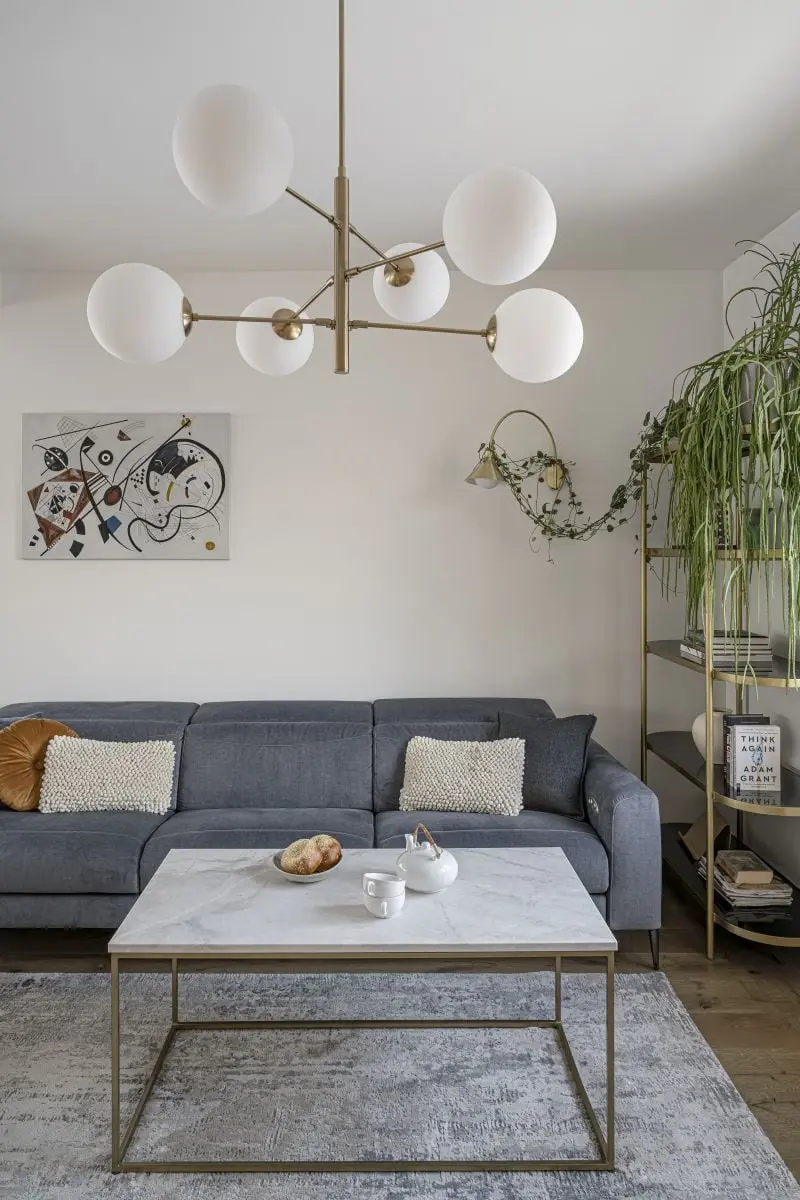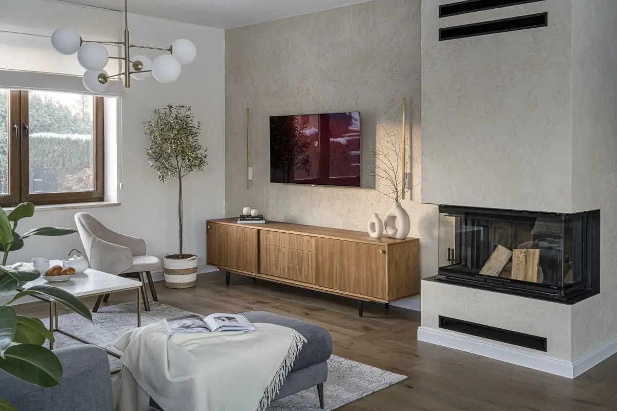 Po przeciwnej stronie znajduje się otwarty salon, urządzony z myślą o relaksie. Stąd głównym elementem wyposażenia jest tu duża, wygodna sofa w grafitowym kolorze. Uzupełniają ją stolik kawowy, zrobiony z tego samego kwarcytu, co blat w kuchni oraz dekoracyjny regał – oba meble z mosiężnymi wykończeniami, które koresponduje z oświetleniem. Elegancki styl pomieszczenia podkreślają drewniane meble o klasycznych formach – nieduże biuro oraz szafka RTV na zgrabnych nóżkach. Naprzeciwko kanapy znajduje się ściana telewizyjna z kominkiem pokryta tynkiem strukturalnym w kolorze piaskowca. Wprowadzając pierwiastek południowo-śródziemnomorski do wnętrza, buduje ona ciepłą, przytulną atmosferę.