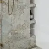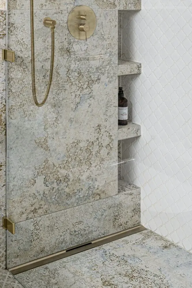 Łazienka główna dedykowana jest właścicielom i stanowi integralną część master bedroom. Dominuje tu styl śródziemnomorski, śmiało nawiązujący do muralu w sypialni. Stąd dynamiczne wzorzyste płytki na części ścian i podłodze połączono z białą mozaiką. To marokańska koniczyna, która poprzez swój kształt podkreśla klimat wnętrza. Wyznacza one też dwie strefy kąpieli. Pierwszą – z wolnostojącą wanną, drugą z wygodną kabiną typu walk-in. W strefie prysznica architektka zdecydowała się na odpływ liniowy Geberit CleanLine w kolorze szampańskim, który stylistycznie współgra z mosiężną armaturą.
