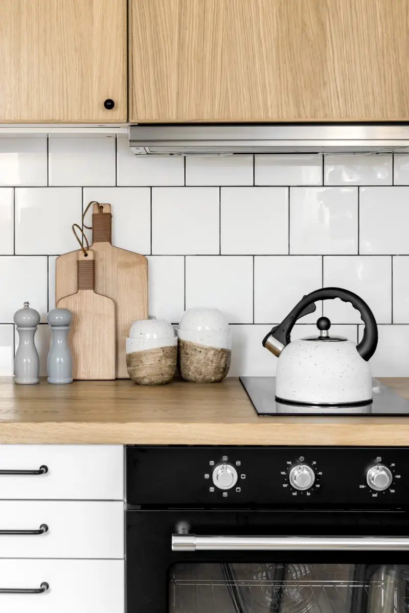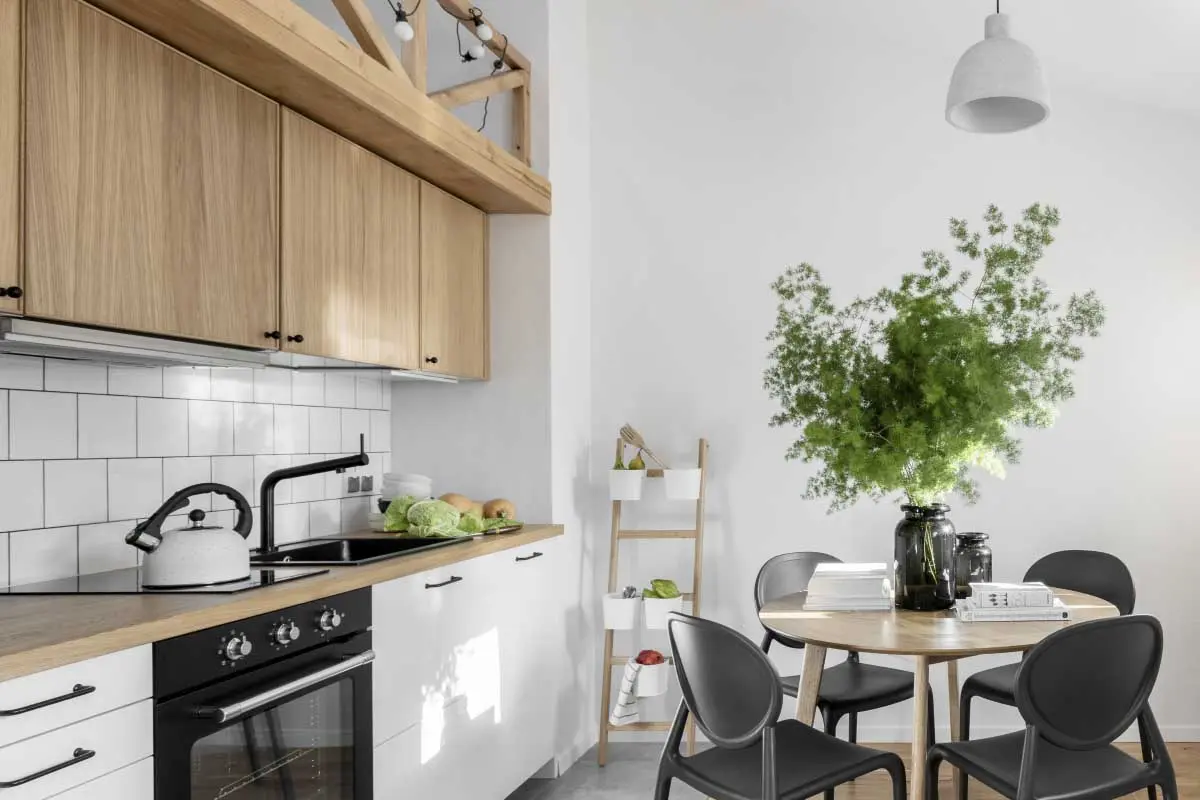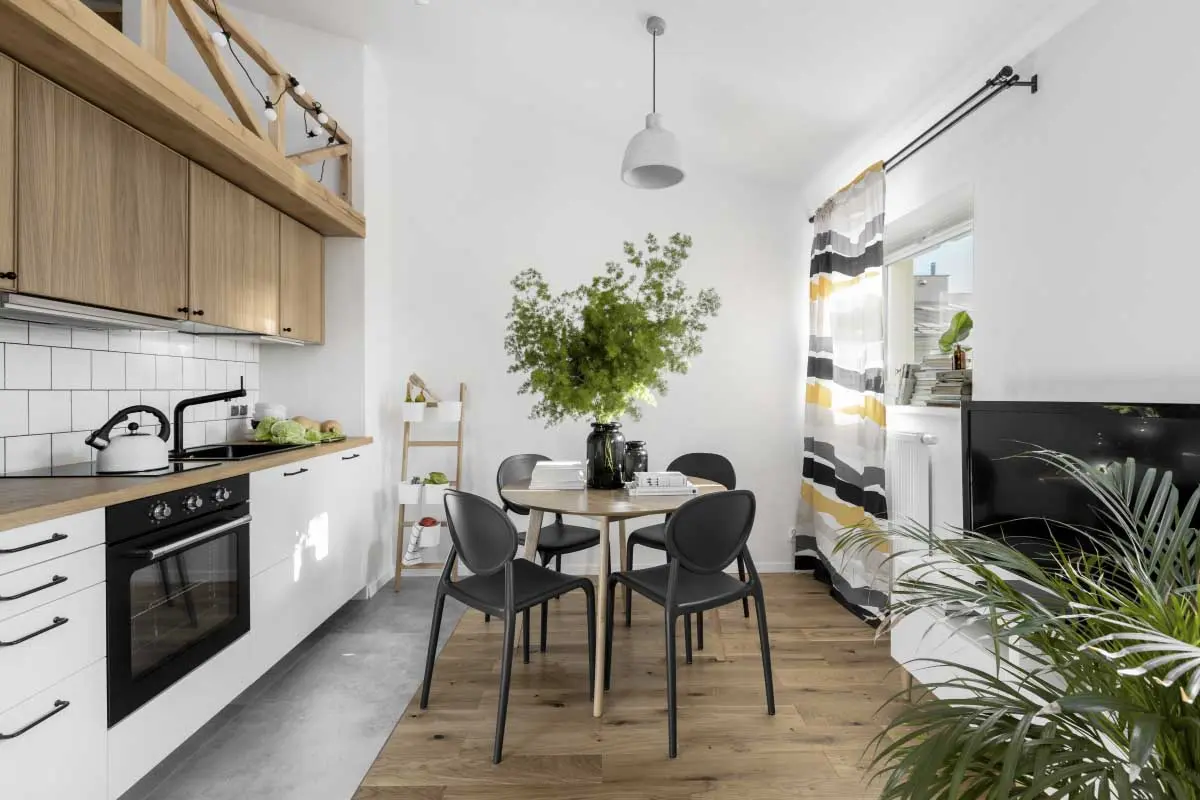 Architektki zdecydowały się na użycie jasnych barw. Tłem wnętrza jest biel pokrywająca ściany, sufit i zabudowę aneksu kuchennego. Pozwoliło to na optyczne powiększenie mieszkania i dodatkowo je rozjaśniło. Dominującym materiałem jest drewno, z którego powstała konstrukcja antresoli, wraz z ciekawą balustradą. Materiał ten został wykorzystany do zbudowania schodków, prowadzących na górny poziom, które jednocześnie spełniają rolę pojemnego regału. Drewniane są również fronty górnych szafek kuchennych oraz blat, a także część podłogi. Wprowadzenie drewna nadało wnętrzu lekkości i skandynawskiego charakteru. Jednak nie zapomniano o historycznym rodowodzie mieszkania, co zostało zaakcentowane płytkami w korytarzu i łazience, nawiązującymi do tych, znajdujących się w holach zabytkowych warszawskich kamienic. Historyzującym elementem są również wieszaki w przedpokoju, stylizowane na kute z żeliwa. Akcentem barwnym jest musztardowy żółty, występujący na kanapie i zasłonach oraz butelkowa zieleń szafki łazienkowej. Dekorację wnętrza stanowią zielone rośliny, które sprawiają, że mieszkanie tętni życiem.