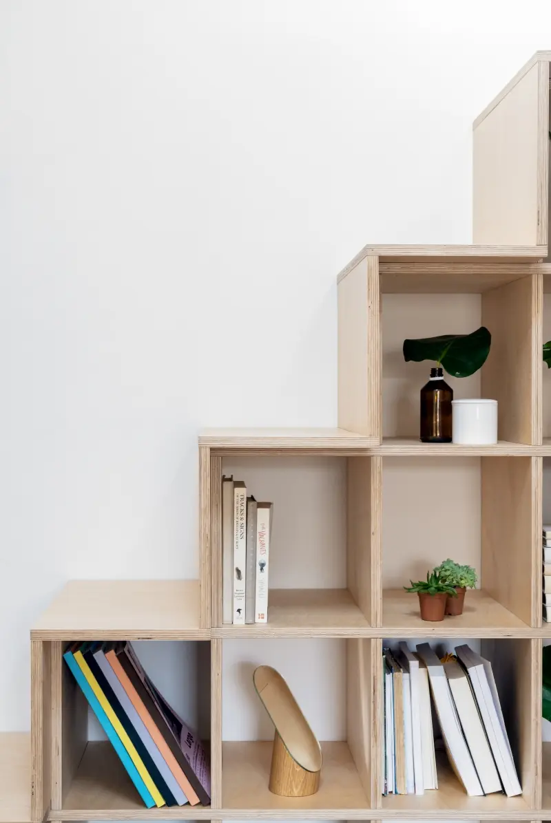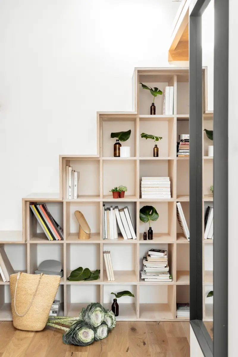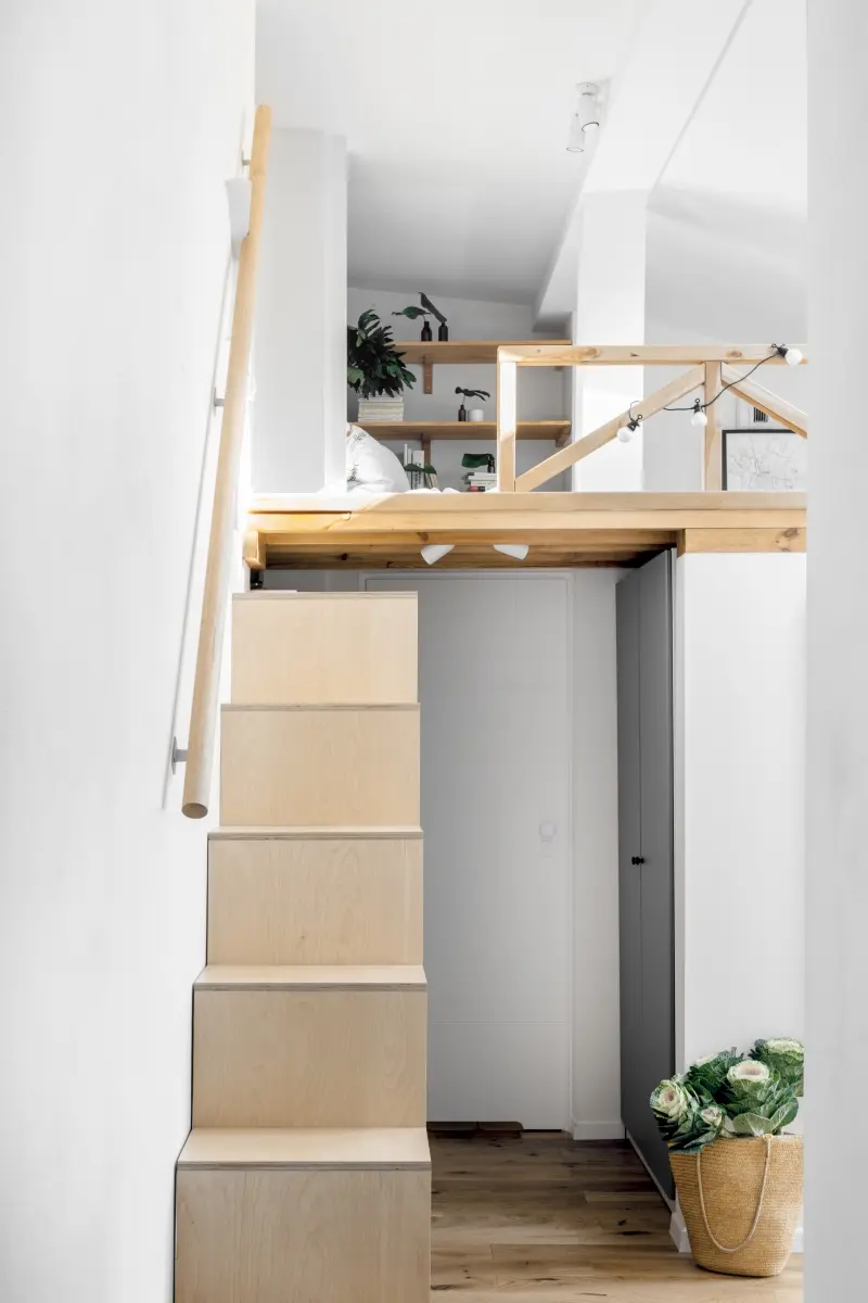 Niewielki metraż mieszkania wymusił zastosowanie systemów do przechowywania, które nie zagracą wnętrza i nie odbiorą cennej powierzchni użytkowej. Bardzo praktycznym rozwiązaniem są schodki prowadzące na antresolę, które jednocześnie spełniają funkcję regału. Pod samą antresolą, poza kuchnią i łazienką, architektkom udało się wygospodarować miejsce na dwie pojemne szafy – jedna przeznaczona na ubrania, a druga gospodarcza. Wygodne miejsce do spania na antresoli, otoczone jest półkami i ścianą korkową. Kuchenne drobiazgi lub owoce i warzywa można przechowywać na drabince z pojemnikami, opartej o ścianę.