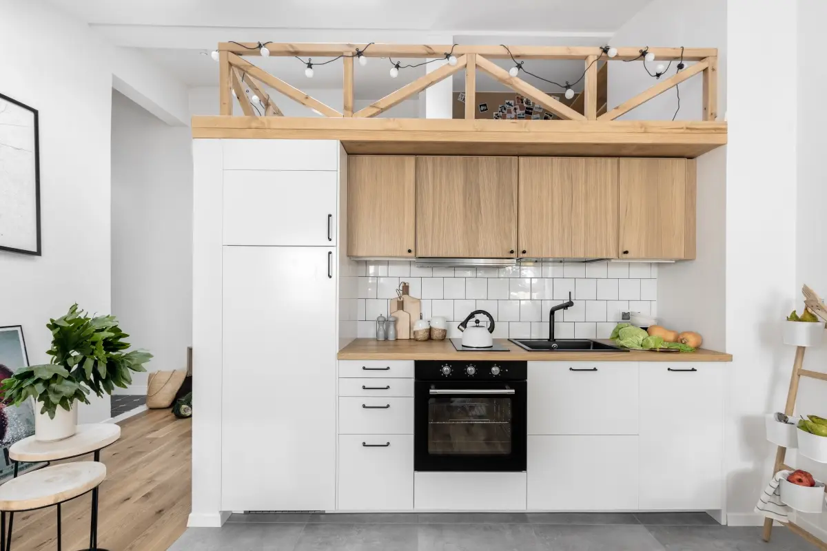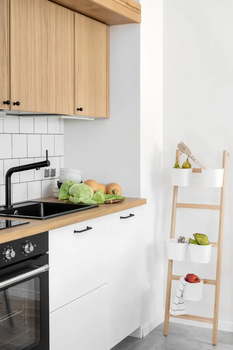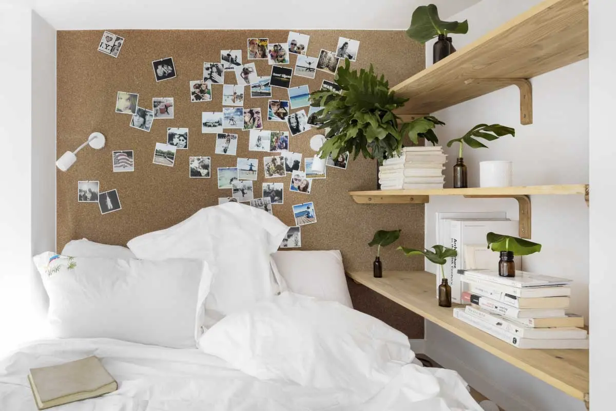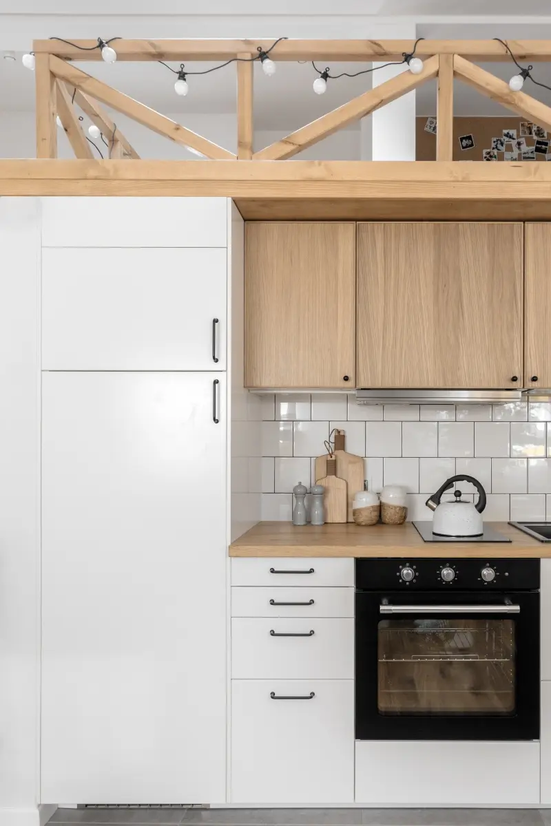 Niewielki metraż mieszkania wymusił zastosowanie systemów do przechowywania, które nie zagracą wnętrza i nie odbiorą cennej powierzchni użytkowej. Bardzo praktycznym rozwiązaniem są schodki prowadzące na antresolę, które jednocześnie spełniają funkcję regału. Pod samą antresolą, poza kuchnią i łazienką, architektkom udało się wygospodarować miejsce na dwie pojemne szafy – jedna przeznaczona na ubrania, a druga gospodarcza. Wygodne miejsce do spania na antresoli, otoczone jest półkami i ścianą korkową. Kuchenne drobiazgi lub owoce i warzywa można przechowywać na drabince z pojemnikami, opartej o ścianę.