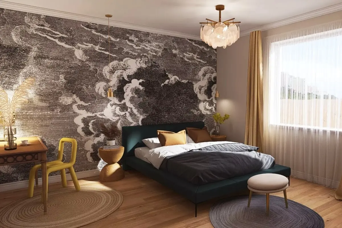 Omawiając tak oryginalny projekt, zaczniemy również niebanalnie – od sypialni. Pomieszczenie to stanowi dosłowny ukłon w stronę marzeń, a to za sprawą tapety z motywem chmur, umieszczonej na ścianie za łóżkiem. Ten niemal malarski efekt nadaje wnętrzu lekkości i niekończącej się historii. Architektka postawiła w aranżacji pomieszczenia na swój ulubiony efekt silnych kontrastów. Przejawiają się one nie tylko w kolorystyce, która pomimo zaskakujących zestawień, harmonijnie ze sobą współgra, ale również wyborze wyposażenia. Mamy tutaj połączenie mebli vintage z nowoczesnym designem. Rolę toaletki pełni odrestaurowany stolik z ciekawymi zdobieniami i dekoracyjnymi nogami. Do niego zostało dobrane żółte krzesło o organicznej formie, przywodzące na myśl styl Memphis Group, który z resztą będzie pojawiał się, także w innych pomieszczeniach. Wnętrze uzupełniają dodatki: dekoracyjne lampy, stoliki nocne, okrągłe dywaniki oraz szklane wazony wypełnione suszonymi roślinami.