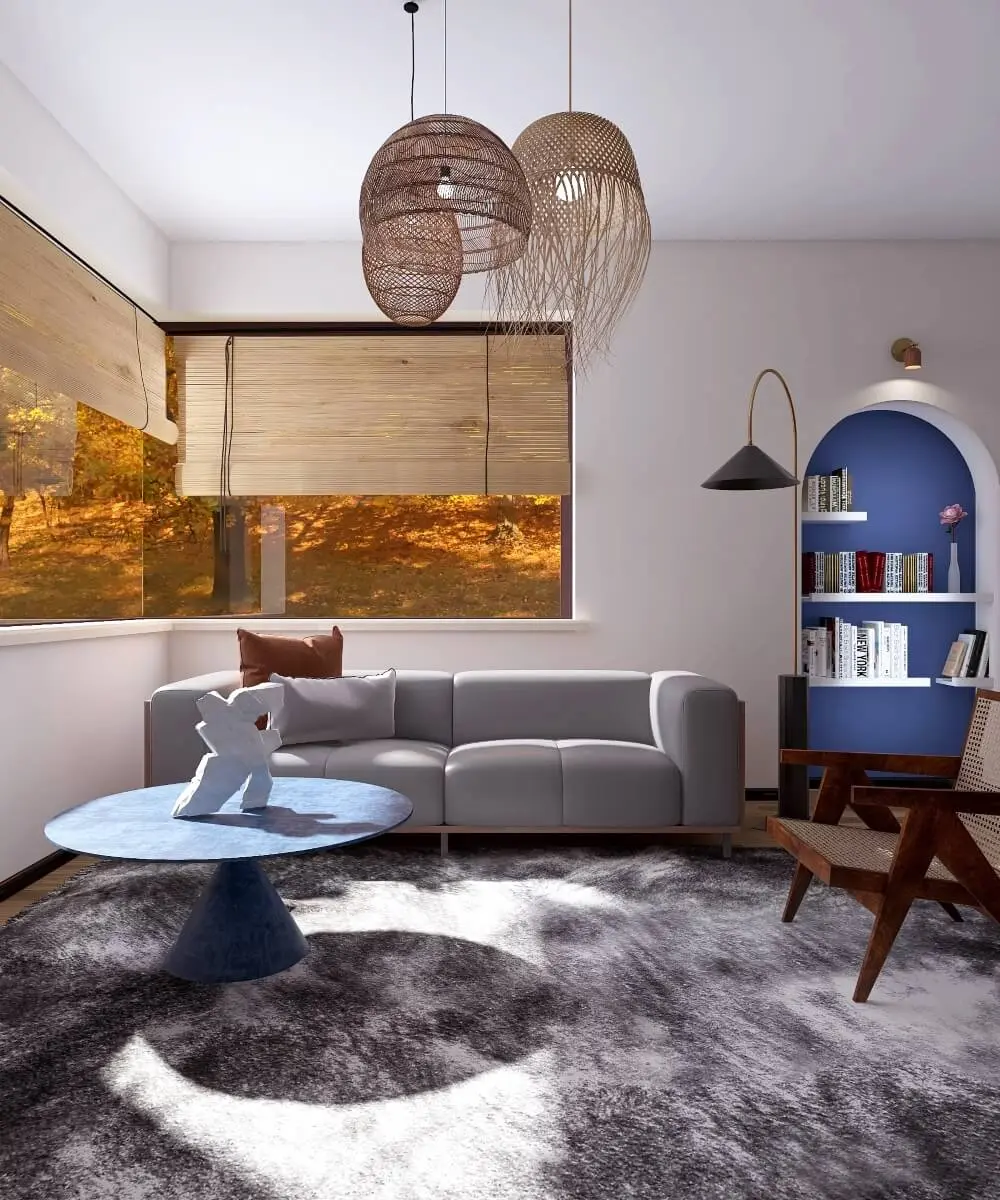 Propozycja aranżacji strefy dziennej jest zainspirowana, wspomnianym już, stylem Memphis Group. Estetyka ta przejawia się w organicznych formach, obłych kształtach, łukach i nasyconych kolorach. Barwnym lejtmotywem wnętrza jest błękit w odcieniu Classic Blue, którego architektka użyła min. do wypełniania łuku, pełniącego rolę biblioteczki. Ciekawa selekcja wyposażenia, podobnie jak w przypadku sypialni, podyktowana była wprowadzeniem silnych kontrastów stylistycznych. Mamy więc tu dość prostą sofę, stolik kawowy z postawą w kształcie stożka, miękki szaroniebieski dywan i zestaw lamp wiszących z plecionymi kloszami. Nie zabrakło również bardziej ekscentrycznych form, takich jak pomocnik przypominający płynny karmel, który stanął obok ratanowego fotela o modernistycznej reminiscencji. Kolejnym przykuwającym wzrok meblem jest komoda na wysoki połysk z uchwytami w postaci dwóch wielobarwnych kamieni o nieregularnych kształtach. Aranżację inspirowaną marzeniami uzupełniają ciekawe dodatki, dekoracyjne oświetlenie oraz obrazy.