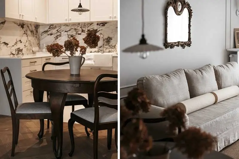 Aleksandra Niepogoda-Bożek z Atelier Harpa podkreśla, że zestawienie unikatowych antyków z meblami zaprojektowanymi przez pracownię sprawiło, że wnętrze zyskało indywidualny charakter i spójną stylistykę. Wyjątkowa harmonia pomiędzy tym co stare i nowe, panuje w strefie wypoczynkowej części dziennej. Sercem salonu jest klasyczna sofa, tapicerowana lnianą tkaniną w odcieniu beżu. Uzupełniają ją poduszki w formie wałków ze wzorem pasów, tak charakterystycznych dla stylu angielskiego. Nad kanapą zawisło francuskie lustro w ozdobnej, drewnianej ramie, zwieńczonej porcelanowym medalionem. Architekci wprowadzili do aranżacji, również zabytkowy stolik pomocniczy i lampę o mosiężnej podstawie. Obok tych unikatowych dodatków, znalazł się autorski stolik kawowy o porowatej strukturze, wykonany w całości z kamienia, a także sizalowy dywan. Delikatna sztukateria oraz parkiet ułożony w jodełkę, wprowadzają do aranżacji klimat paryskich kamienic.