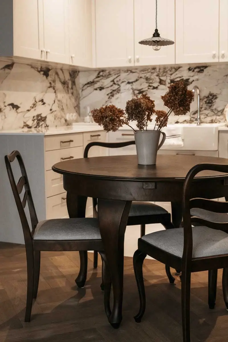 Mieszkanie znajdujące się na Dolnym Mokotowie, można potraktować jako credo pracowni Harpa. Odnajdziemy w nim wszystko, co jest istotne dla architektów w procesie projektowym: dążenie do wyrafinowania i harmonii, naturalne materiały oraz inspiracje historią. Natomiast inspiracją dla prezentowanego wnętrza był klasyczny styl angielski, którego elementy wykorzystano w części dziennej. Ozdobione sztukateriami ściany i stolarkę kuchenną pomalowano na złamany odcień bieli (off-white). Nad blatem zastosowano marmurowe płytki o kontrastowym rysunku żył. Ich kolorystyka harmonijnie współgra z barwami wykorzystanymi w aranżacji. Prosta zabudowa o frezowanych frontach, wzbogacona mosiężnymi uchwytami oraz ceramiczny, głęboki zlewozmywak, nawiązuje do brytyjskich „farmhouses”. Jednocześnie elementy te idealnie komponują się z elegancką i kamieniczną odsłoną stylu angielskiego, zaproponowaną przez architektów. Ciekawym elementem aneksu kuchennego jest autorski kredens, stylizowany na vintage i będący silnym kontrapunktem wobec jasnej zabudowy. Mebel został pokryty farbą w głębokim, czekoladowym odcieniu, która daje efekt wysokiego połysku. Górną część zajmuje przeszklona gablotka, gdzie można eksponować zastawę stołową. Natomiast sercem kuchni jest odrestaurowany, zabytkowy stół wraz z kompletem krzeseł.