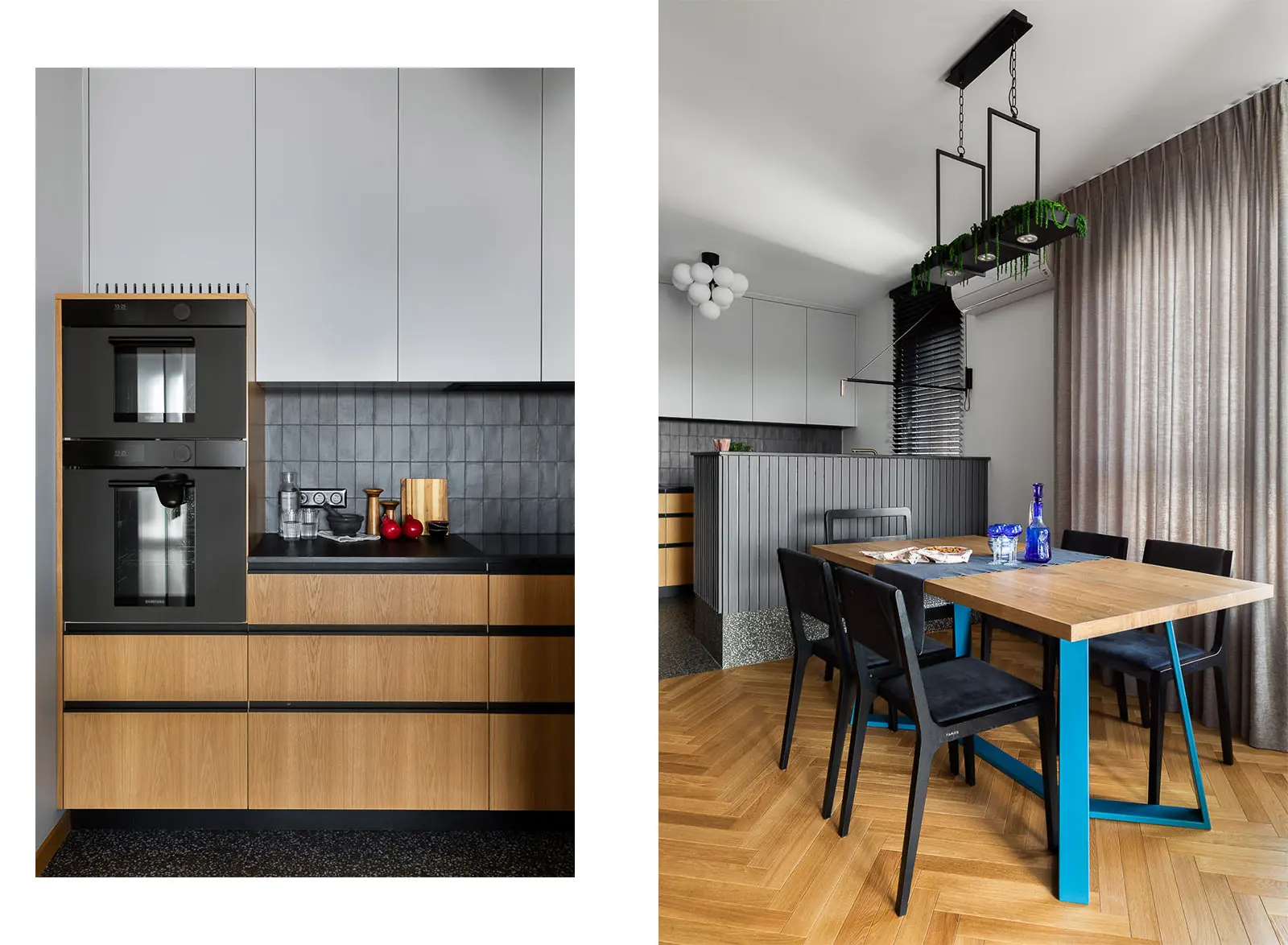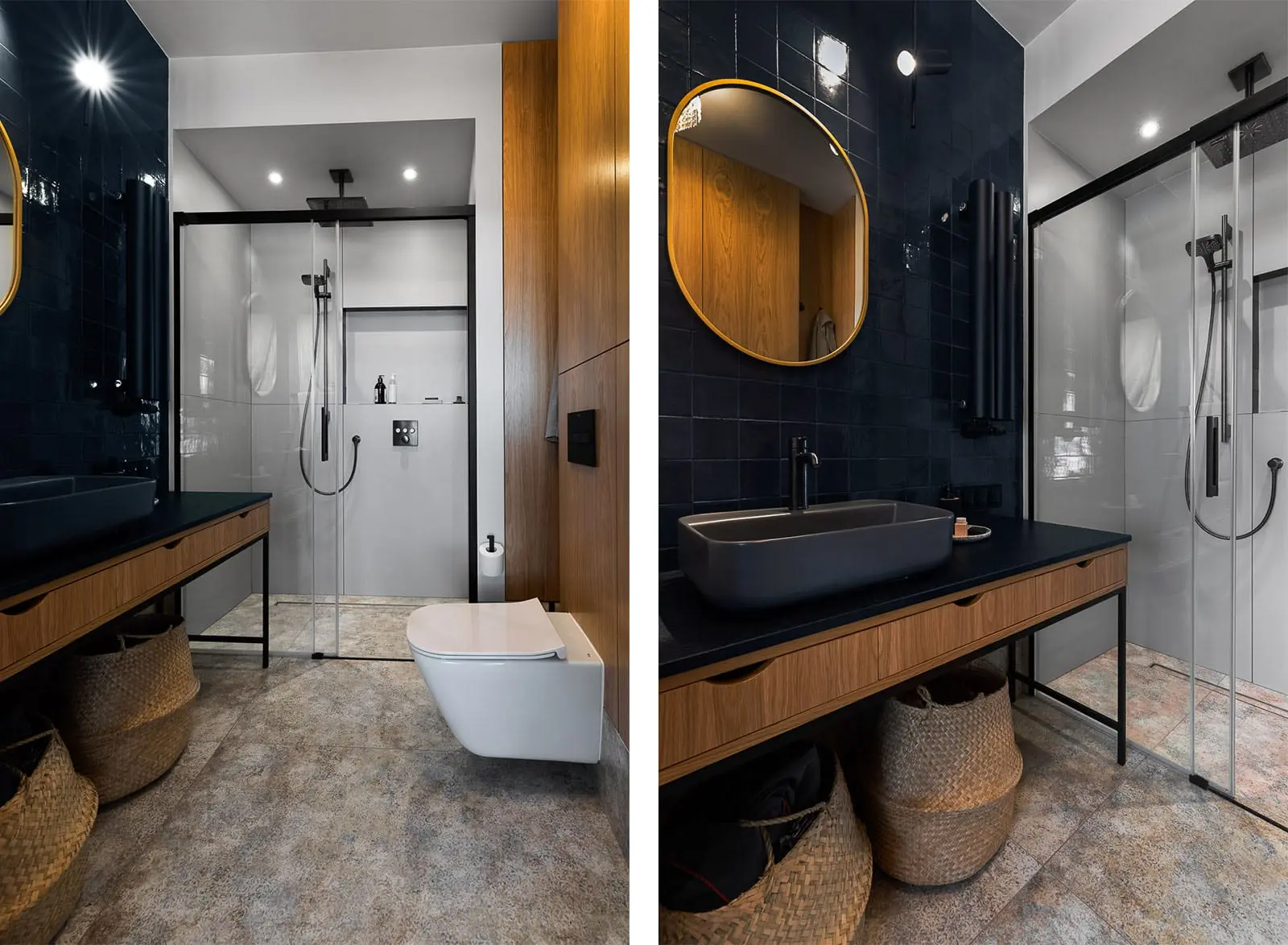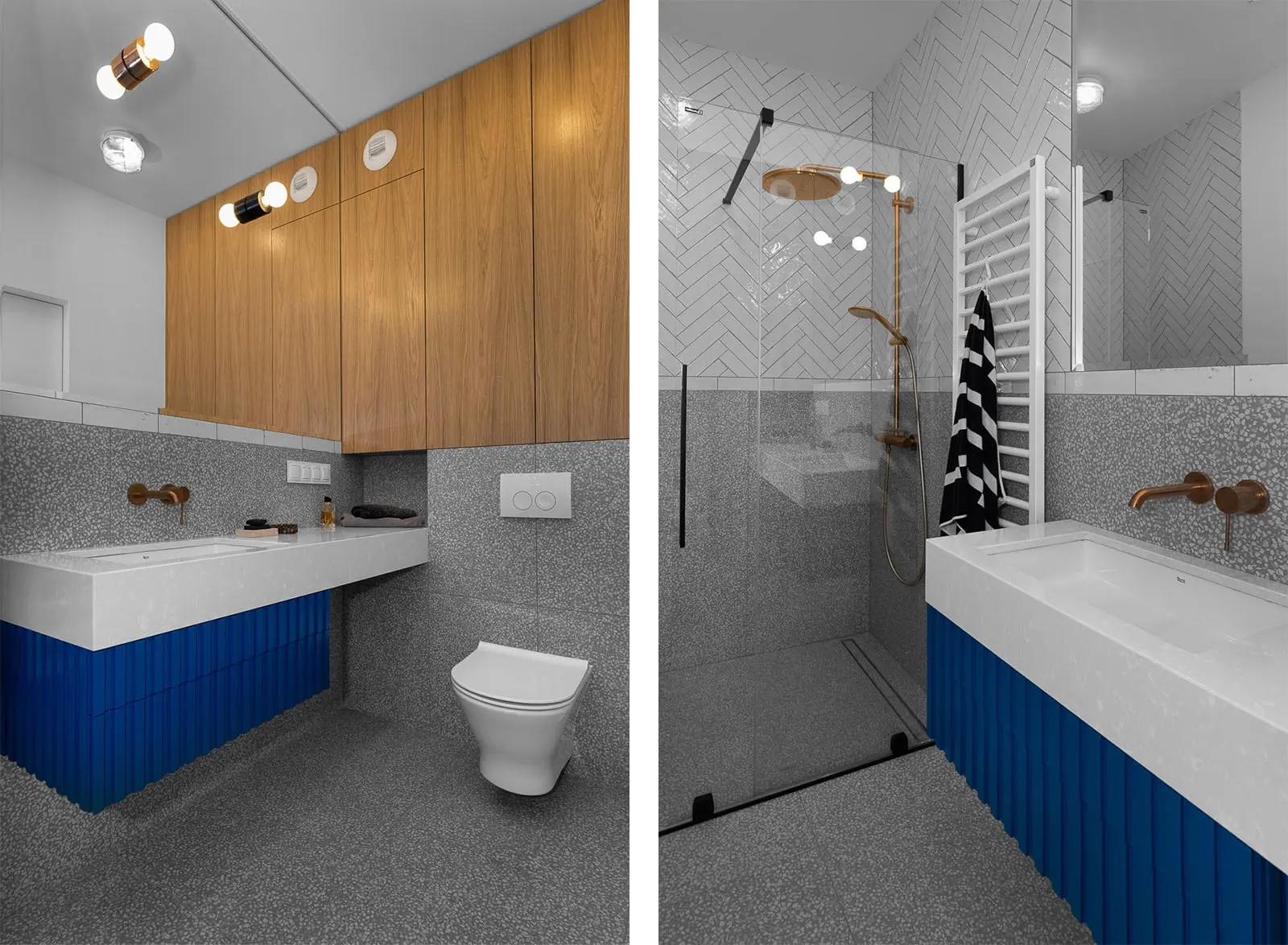 Wszystkie pomieszczenia mają ten sam charakter oparty na zestawieniu różnorodnych stylów, ale też łagodnym przenikaniu elementów wyposażenia. Francuska dębowa jodełka na podłodze z jodełką z płytek ściennych w łazience ogólnej. Sztukaterie w formie ram i listew ściennych, tych klasycznych, ale też i nowoczesnych, lamelkowych z ozdobną, bogatą w formie rozetą sufitową podkreślającą klimatyczną lampą. Współczesne, techniczne oświetlenie uzupełniane stylowymi retro lampami. Czarny matowy metal, ale też błyszcząca złocista miedź. Płytki wielkoformatowe, gładkie, zestawione z małymi, naturalnie wypalanymi kaflami. Ciepłe, wyraziste, rodzime drewno z czarnym, chropowatym granitem i monochromatycznym lastryko. Kolory eleganckie: beżowo-szary z ciemnym grafitem i winną czerwienią skontrastowane z intensywnym, żywym niebieskim. Zabudowa na wymiar – prosta, funkcjonalna, zestawiona z rzemieślniczymi meblami o artystycznym, zindywidualizowanym wyglądzie.