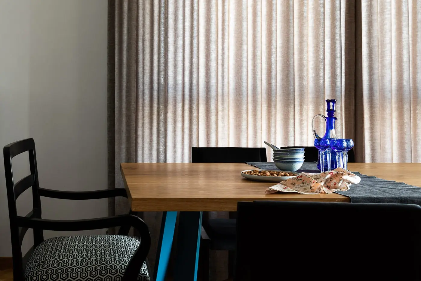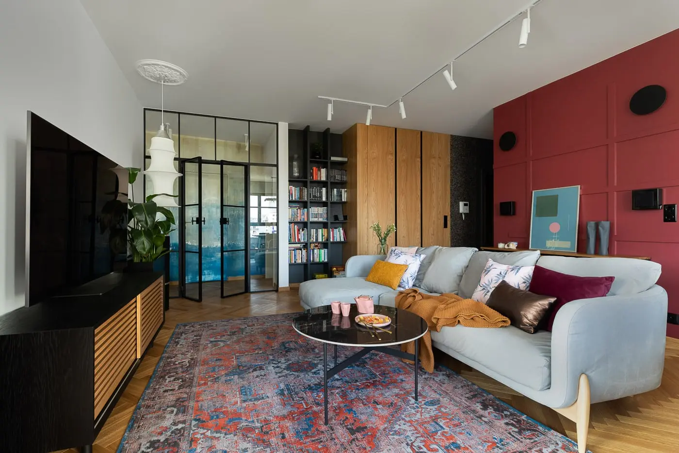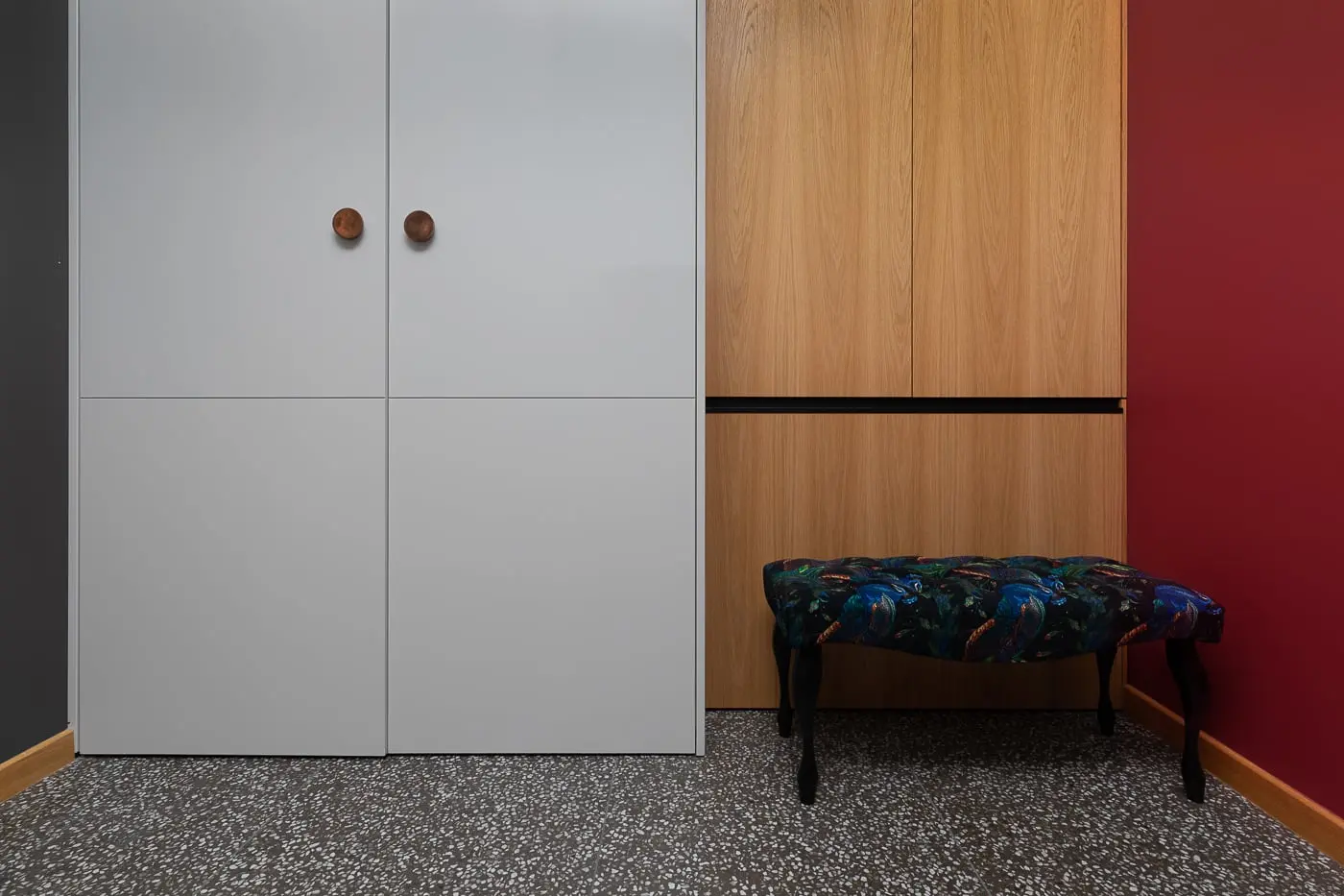 Wszystkie pomieszczenia mają ten sam charakter oparty na zestawieniu różnorodnych stylów, ale też łagodnym przenikaniu elementów wyposażenia. Francuska dębowa jodełka na podłodze z jodełką z płytek ściennych w łazience ogólnej. Sztukaterie w formie ram i listew ściennych, tych klasycznych, ale też i nowoczesnych, lamelkowych z ozdobną, bogatą w formie rozetą sufitową podkreślającą klimatyczną lampą. Współczesne, techniczne oświetlenie uzupełniane stylowymi retro lampami. Czarny matowy metal, ale też błyszcząca złocista miedź. Płytki wielkoformatowe, gładkie, zestawione z małymi, naturalnie wypalanymi kaflami. Ciepłe, wyraziste, rodzime drewno z czarnym, chropowatym granitem i monochromatycznym lastryko. Kolory eleganckie: beżowo-szary z ciemnym grafitem i winną czerwienią skontrastowane z intensywnym, żywym niebieskim. Zabudowa na wymiar – prosta, funkcjonalna, zestawiona z rzemieślniczymi meblami o artystycznym, zindywidualizowanym wyglądzie.