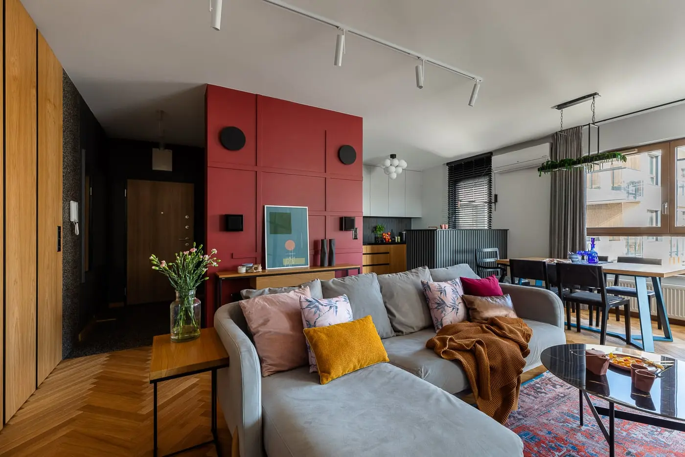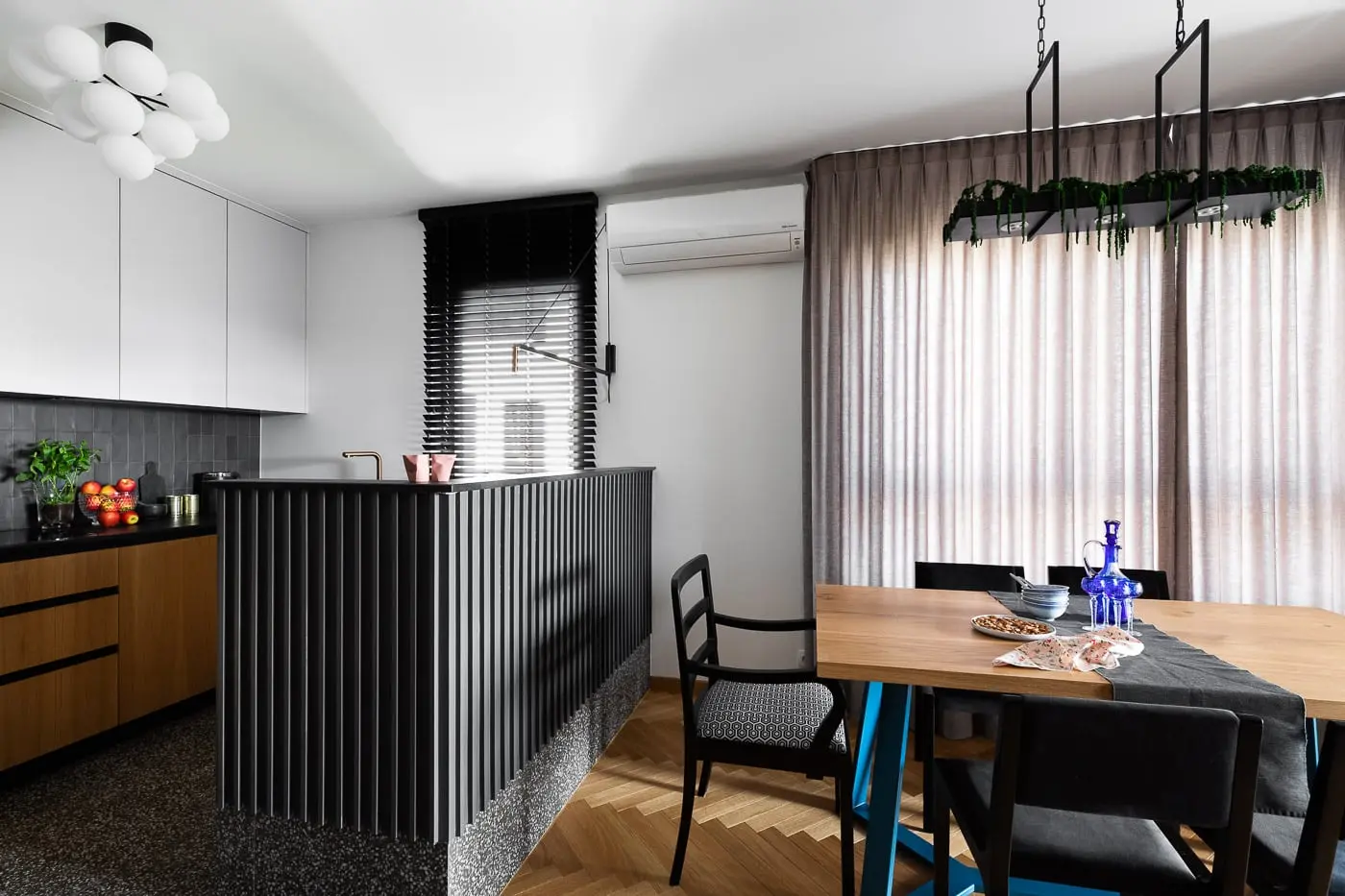 Powstało kilka nowych układów, ale wszystkie zakładały maksymalne otwarcie przestrzeni oraz zminimalizowanie ciągów komunikacyjnych. Wybrany ostateczny wariant otworzył kuchnię na salon, częściowo zasłaniając ją barkiem wykończonym lamelami, równocześnie zamykając ją od strony holu wejściowego zabudową meblową dwustronną m.in. lodówki, z dużą ilością powierzchni do przechowywania. Salon zyskał otwartą przestrzeń w której wygodny, klasyczny narożnik stał się jego oficjalnym centrum.