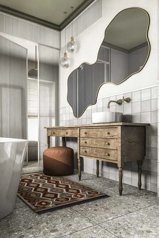 Bardzo ciekawe rozwiązanie zostało zaproponowane przez architektkę w jednej z łazienek. Mianowicie tapeta na suficie, która zdobywa coraz większą popularność wśród inwestorów. Wzór liści koresponduje z tropikalnymi inspiracjami z sypialni. Nie zabrakło tutaj kolonialnych reminiscencji, takich jak podstawa pod umywalkę w formie lekkich, tłoczonych nóżek, złote kinkiety czy drewniana zabudowa szafek. Podłogę pokrywają płytki o teksturze szarego lastryko, które współgrają z resztą aranżacji.