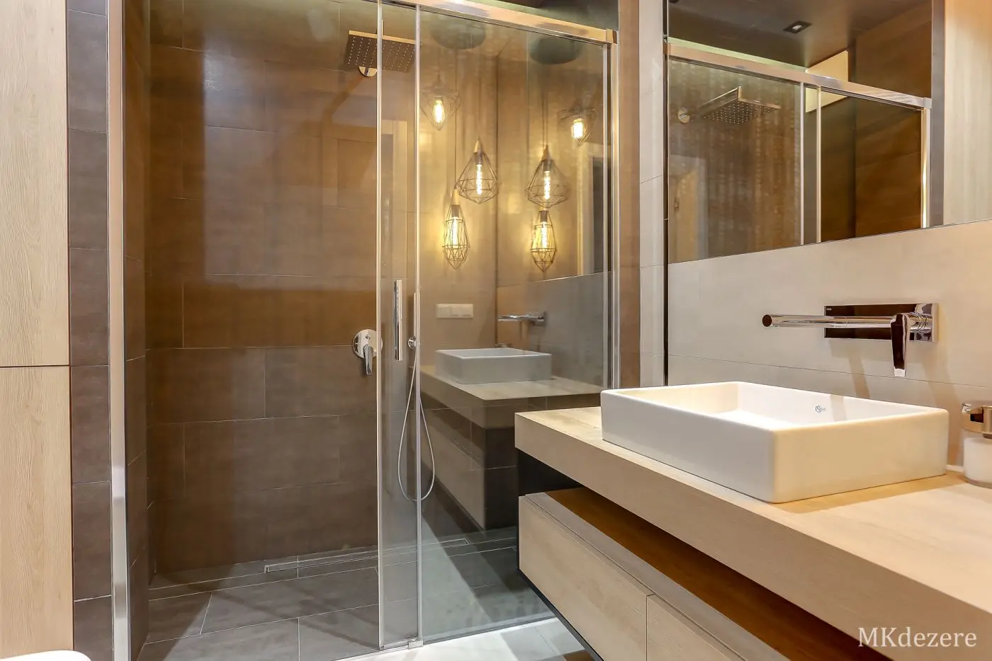 Łazienka, jak i reszta mieszkania jest niezwykle ciepła w odbiorze. Na dużym blacie o szerokości niemal 130 cm architekt umieściła umywalkę stawianą na blacie Bateria umywalkowa podtynkowa pochodzi z firmy Tres. Pod grubym blatem znajduje się półka na ręczniki i 2 szuflady. Na ścianie nad blatem duże sięgające sufitu lustro, które powiększa niewielką przestrzeń.