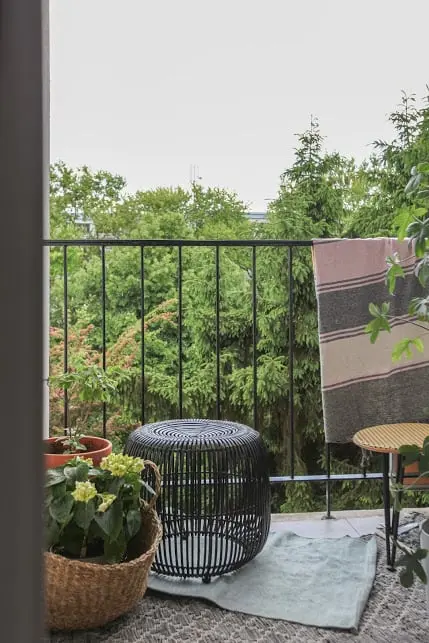 Naturalnym przedłużeniem niewielkiego salonu jest balkon, o którego aranżację również zadbały architektki z Morr Studio. Domownicy mogą relaksować się na świeżym powietrzu pośród zróżnicowanych tekstyliów, rattanu i rafii a także pokaźnej kolekcji roślin, które w towarzystwie zielonego ogrodu Mokotowa, tworzą niezwykle zgrany duet.