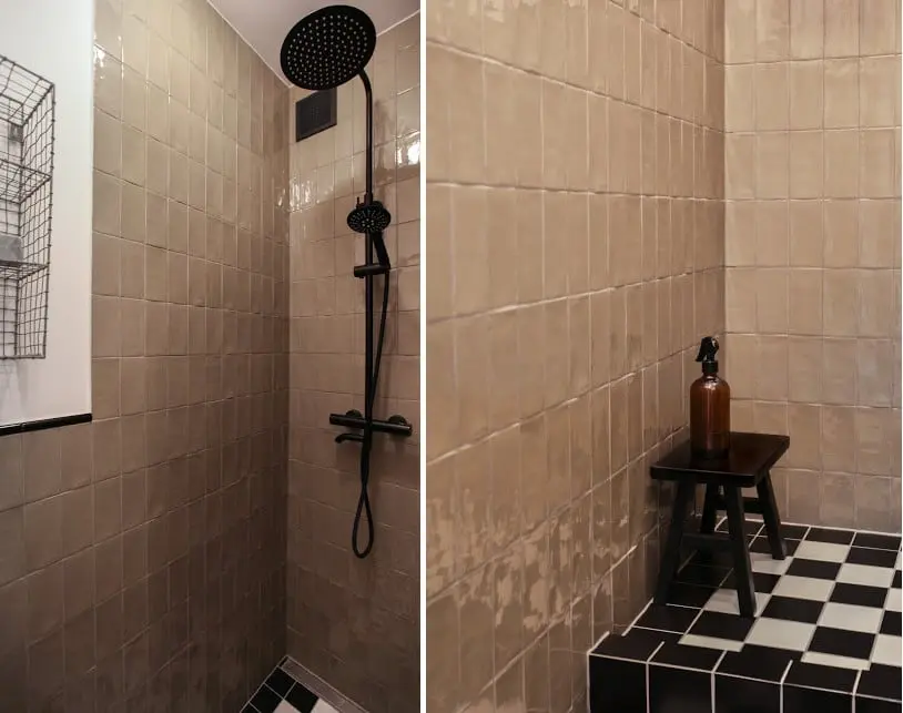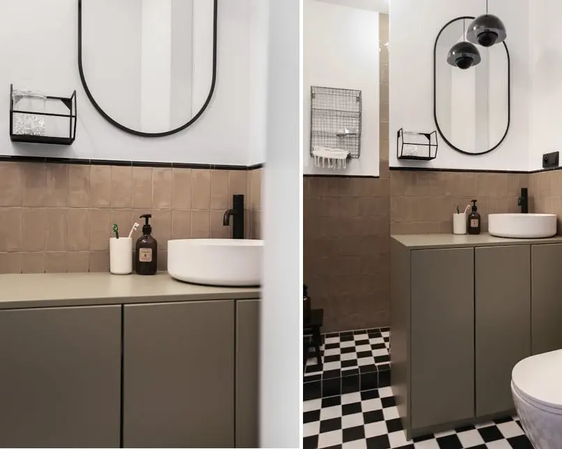 Jeśli chodzi o wystrój, architektki postawiły na nieśmiertelną klasykę. Proste płytki ułożone w biało – czarną szachownicę nadają dynamikę wnętrzu. Ceramika ułożona tylko do połowy ścian poprawia proporcje niewielkiej łazienki. Pomimo, że architektki wybrały płytki w stylu wabi – sabi aranżacja jest pełna uroku. Kontrolowana niedoskonałość wraz z delikatnymi dodatkami sprawiają, że wnętrze jednocześnie sięga do korzeni projektowania i świetnie wpisuje się w aktualne trendy.