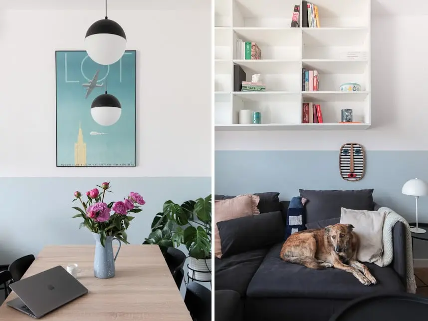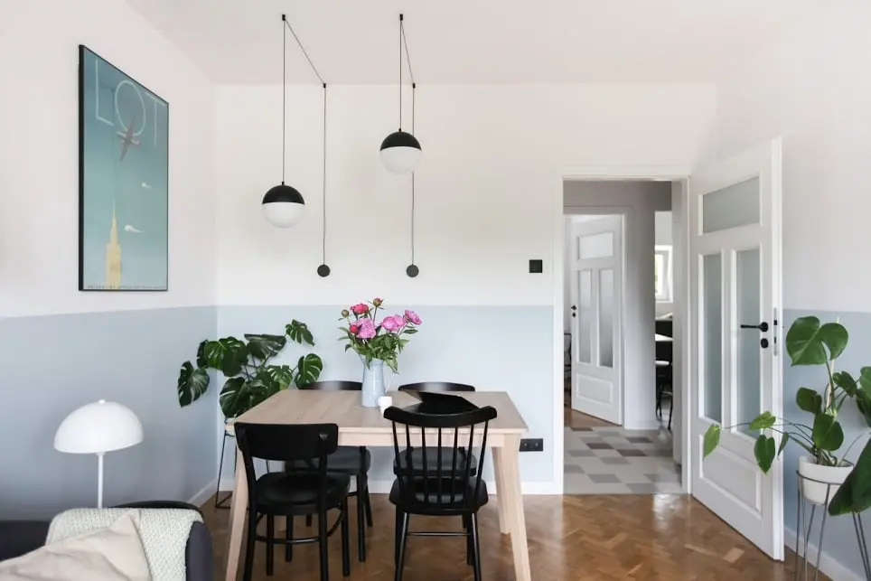Punktem wyjścia dla projektu był drewniany parkiet, który szczęśliwie udało się zachować. Tę klasyczną bazę architektki uzupełniły błękitną lamperią, przeżywającą aktualnie swój renesans. Jasny odcień niebieskiego stanowi piękne tło dla licznej roślinności.