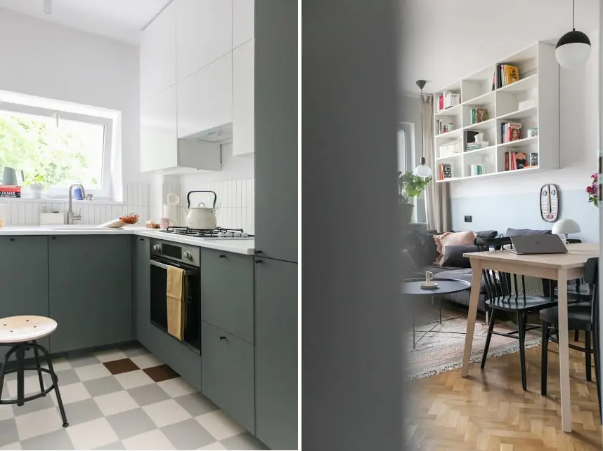 Ważnym miejscem dla inwestorów była kuchnia, ponieważ uwielbiają gotować. Architektki zaproponowały rozwiązania charakteryzujące się nienaganną prostotą i wymaganą funkcjonalnością. Trafnym wyborem były górne szafki sięgające aż do sufitu, dzięki czemu właściciele bez problemu mogą zmieścić pełne wyposażenie kuchni. Ich lekka forma nie przytłacza małego pomieszczenia a neutralna biała tonacja idealnie współgra z zielenią obecną w dolnej zabudowie. Minimalistyczne uchwyty wraz z baterią, stanowią biżuterię kuchni. Uroku pomieszczeniu dodaje stary kafel zachowany w oryginalnym miejscu.
