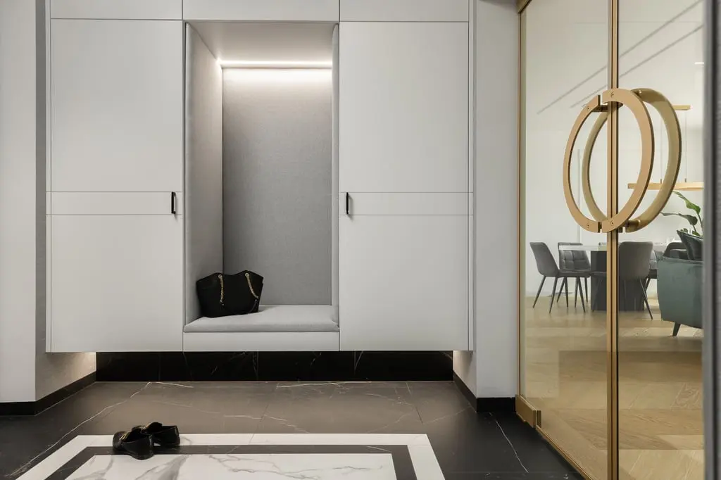 Mówi się, że to co tuż za progiem jest zapowiedzią tego co zobaczysz w głębi. Coś w tym jest. Dlatego gospodarzom zależało na przedpokoju, który będzie piękną wizytówką ich wspólnego gniazdka. I tak do przestronnego salonu prowadzi ciekawie zaprojektowany przedsionek połączony z częścią garażową. Właściciele cenią sobie porządek, dlatego architektka zaproponowała podwieszane szafy z pomysłowo rozwiązaną podświetlaną wnęką do siedzenia. Całość sprawia wrażenie jakby lekko lewitowała nad podłogą co dało ciekawy efekt optyczny. Na przeciwko szaf znalazła się przestrzeń na duże okrągłe lustro i zgrabną konsolę na podręczne drobiazgi. Praktyczną, bo łatwą do utrzymania w czystości podłogę, wykończono wielkoformatowym spiekiem z ładnym użyleniem imitującym szlachetny marmur.