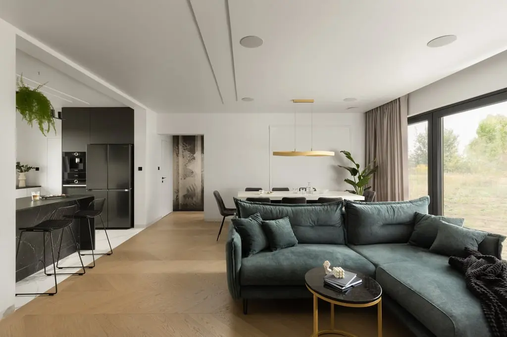 Właściciele chcieli, żeby dom nie był zbyt nasycony wyrazistymi kolorami, ale też nie zupełnie neutralny. Dlatego zdecydowali się na spokojne odcienie, w których dobrze się odpoczywa. Klasyczne połączenie bieli i czerni ocieplają beże, szarości, a rozświetlają akcenty złota. Mocniejszym akcentem, który spaja stonowane tonacje jest zieleń, która pojawia się na obiciu sofy oraz w postaci roślin. Dużo ciepła do wnętrza wprowadza naturalna klepka na podłodze Wzór francuskiej jodełki, który kojarzy się z wnętrzami stylizowanymi na historyczne, tu nadaje elegancji i przytulności nowoczesnej przestrzeni.