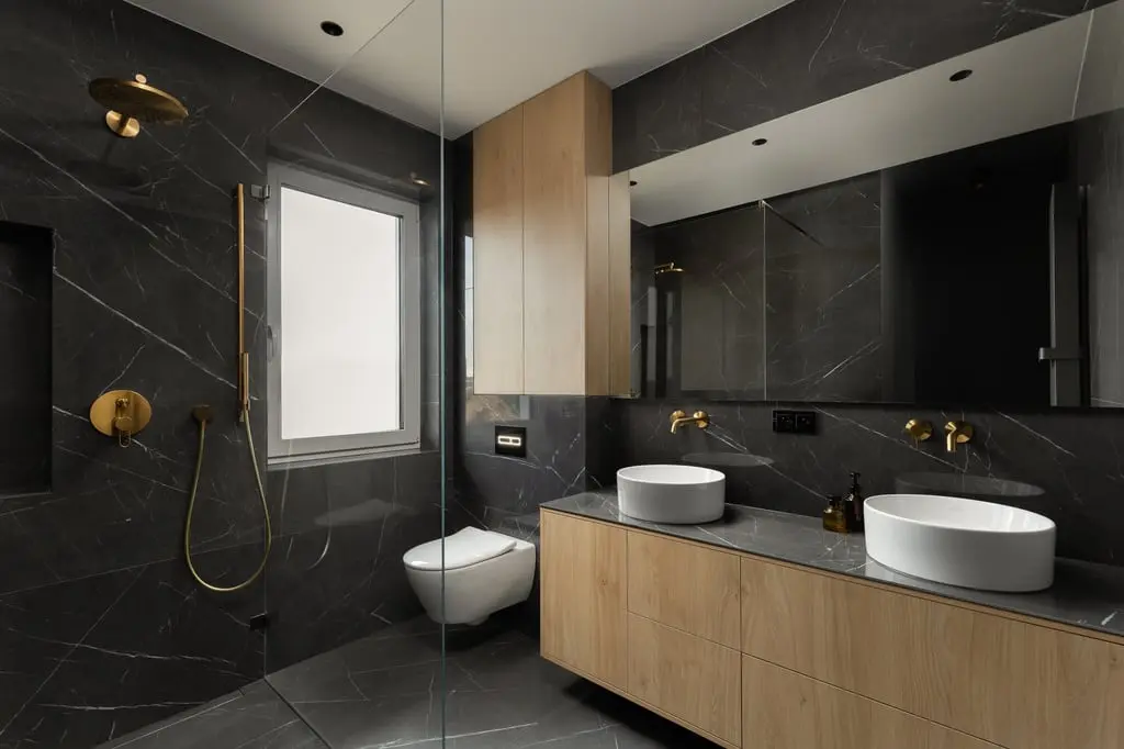 Właścicielom zależało na wysokiej jakości materiałach i kolorach, które szybko się nie znudzą i nie wyjdą z mody. Architektka postawiła na ponadczasowa klasykę. Ciemne spieki z jasnymi żyłkami ocieplają elementy meblowe z jasnego drewna. Całość ładnie komponuje się z białą ceramiką oraz bateriami ze w odcieniu szczotkowanego mosiądzu. Karolina wybrała do umywalek jednouchwytowy model podtynkowy z serii AXOR One – z prostą wylewką i mieszaczem. Wygląda bardzo estetycznie i nie zaburza minimalistycznych tafli wielkoformatowych spieków.
