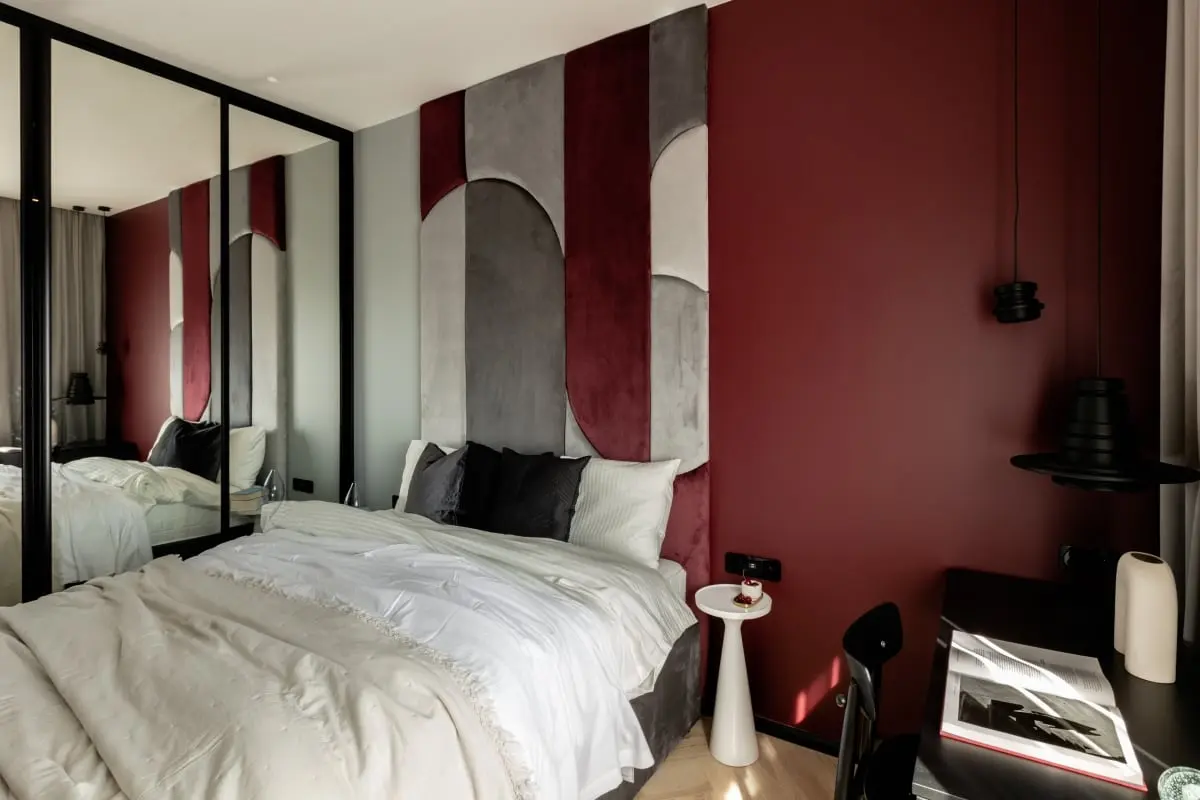 Drugą stronę mieszkania zajmuje część nocna z łazienką. Tutaj również nie zabrakło motywu przewodniego, jakim jest winny odcień czerwieni. Architekci zastosowali bardzo ciekawe rozwiązania na ścianie za łóżkiem. Jedną część pomalowano na bordowo, natomiast drugą na jasno-szaro. Pomiędzy tymi dwoma pasami zainstalowano welurowe zagłowię, na całej wysokości ściany. Zastosowany wzór nawiązuje do klimatów retro (podobnie jak przepierzenie w salonie). Fronty szafy w całości pokryte są lustrami, dzięki czemu wnętrze jest jaśniejsze i optycznie poszerzone. Efekt ten jest szczególnie spotęgowany, gdy drzwi odbijają widok zza okna. Udało się tu również wygospodarować miejsce na niewielkie biurko, które może służyć jako toaletka lub przestrzeń do pracy.