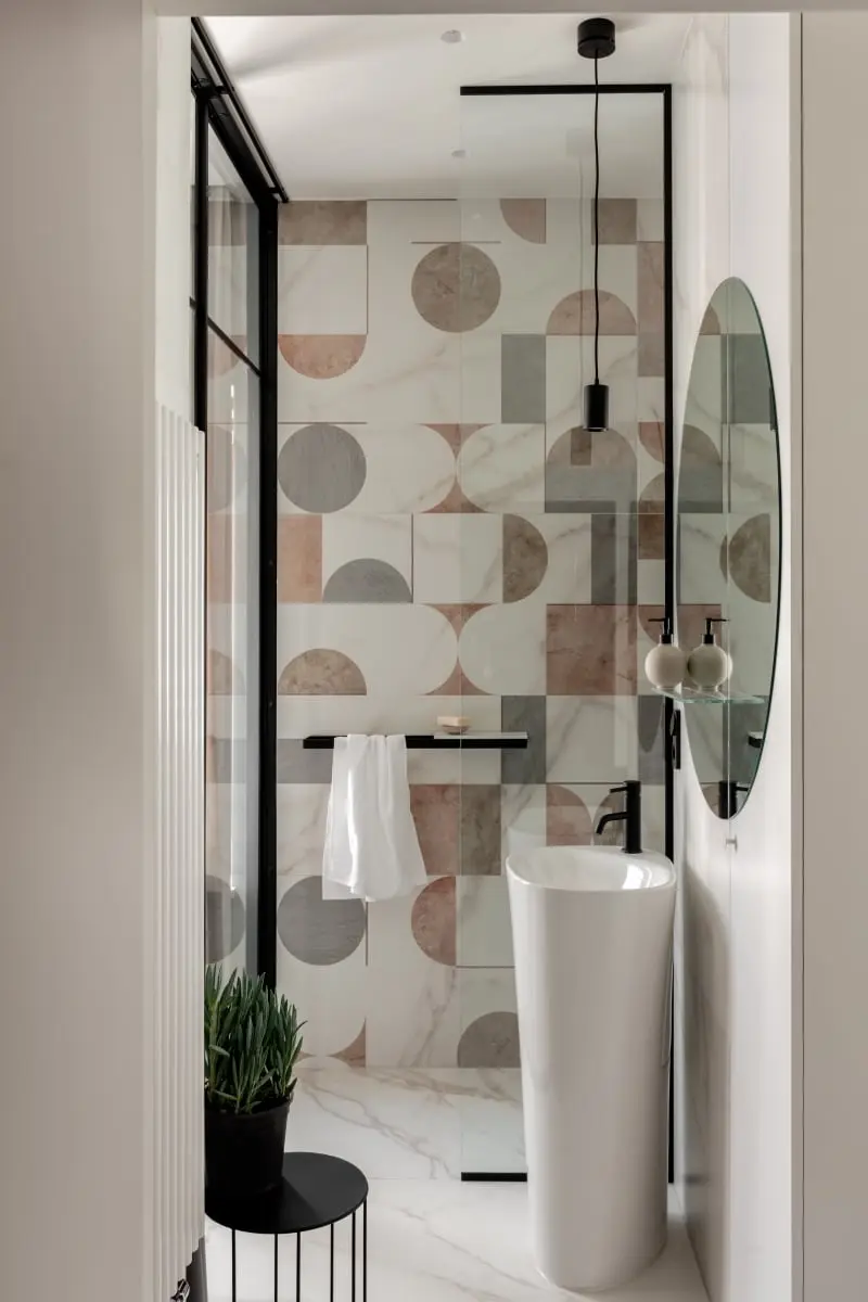 Szklana ściana z metalowymi profilami wydziela strefę łazienki. Można ją dodatkowo zasłonić dzięki szarej kotarze. Salon kąpielowy powtarza motywy kolorystyczne reszty mieszkania, natomiast w tym wypadku postawiono na ich rozbieloną wersję. Głównym elementem dekoracyjnym jest ściana pod prysznicem, pokryta płytami Ornamenta z kolekcji Metafisico. Marmurowa mozaika z figurami geometrycznymi w pastelowych odcieniach czerwieni, błękitu i szarości jest subtelnym nawiązaniem do retro lejtmotywu, przewijającym się w całej realizacji. Architekci dobrali do niej płytki podłogowe z teksturą marmuru o delikatnych żyłkach. Wysoka umywalka wolnostojąca i duże okrągłe lustro dodają salonowi kąpielowemu niezwykłej elegancji. Całość dopełnia czarna armatura oraz oświetlenie.