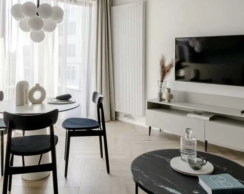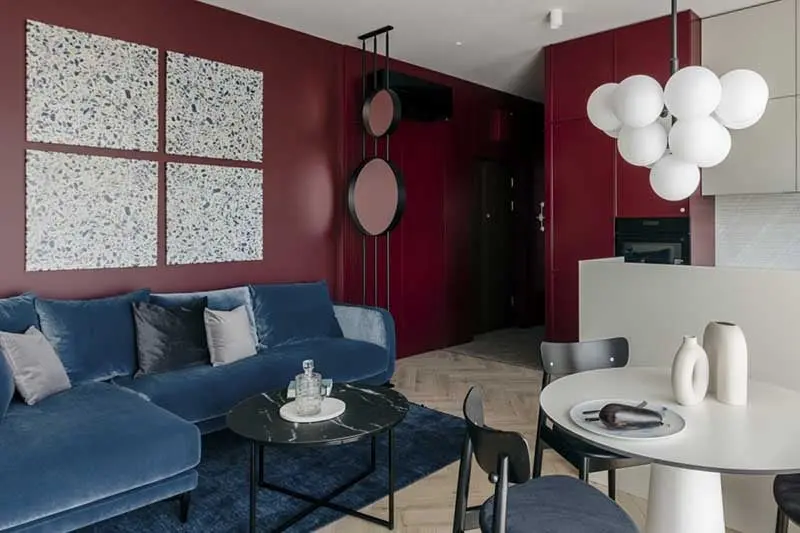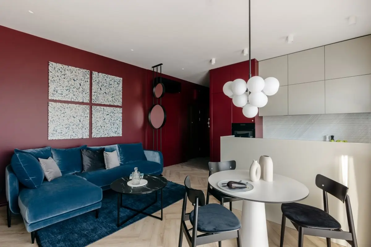 Przekraczając próg 45-metrowego mieszkania, od razu zatapiamy się w pięknym odcieniu bordo. Pokryte nim ściany oraz zabudowy szaf, prowadzą nas ku części dziennej. Tutaj architekci zdecydowali się na mocny kontrast winnej czerwieni z bielą oraz akcentami w postaci granatu. Ściana, będąca przedłużeniem przedpokoju, stanowi tło dla strefy wypoczynkowej, gdzie króluje welurowy narożnik w kolorze Classic Blue. Dobrano do niego dywan w tym samym odcieniu, a nad sofą zawisła kompozycja czterech kwadratów o teksturze lastryko. Przeciwwagą dla ciemnych kolorów jest złamana biel, którą wykorzystano w pozostałej części pomieszczenia. Zabieg ten, wraz z jasnym parkietem w jodełkę, nadał przestrzeni harmonii. Kontrast zastosowano również w aneksie kuchennym. Tutaj architekci wykorzystali wysoką zabudowę do płynnego przeprowadzenia koloru z korytarza. Bordo zastosowano dla dolnych szafek. Natomiast górne szafki oraz blaty są w kolorze białym. Klamrą spinającą zestawienia barwne są czarne detale: zlewozmywak, bateria kuchenna krzesła jadalniane oraz stolik kawowy. Warto zwrócić uwagę, także na oryginalne przepierzenie między holem a salonem. Architekci zaproponowali tu metalową konstrukcję z lustrzanymi okręgami. Nadaje ona ciekawego twistu w klimacie retro.